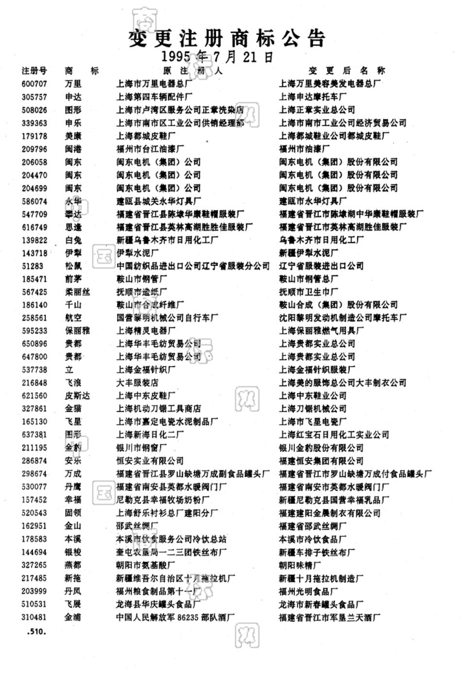 商标注册人申请人名义及地址变更公告 1995-07-21 第504期 查看公告