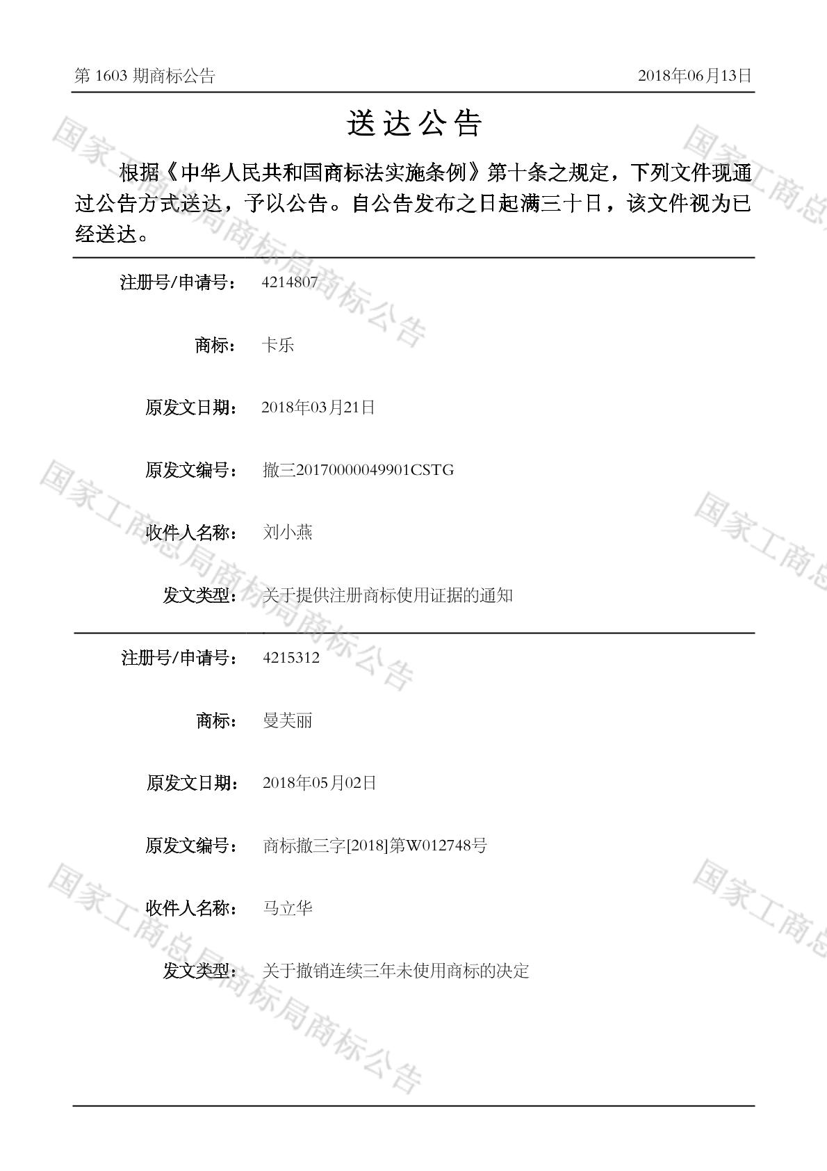 2018-06-13 撤销连续三年停止使用注册商标 | 排版送达公告(关于提供注册商标使用证据的通知)