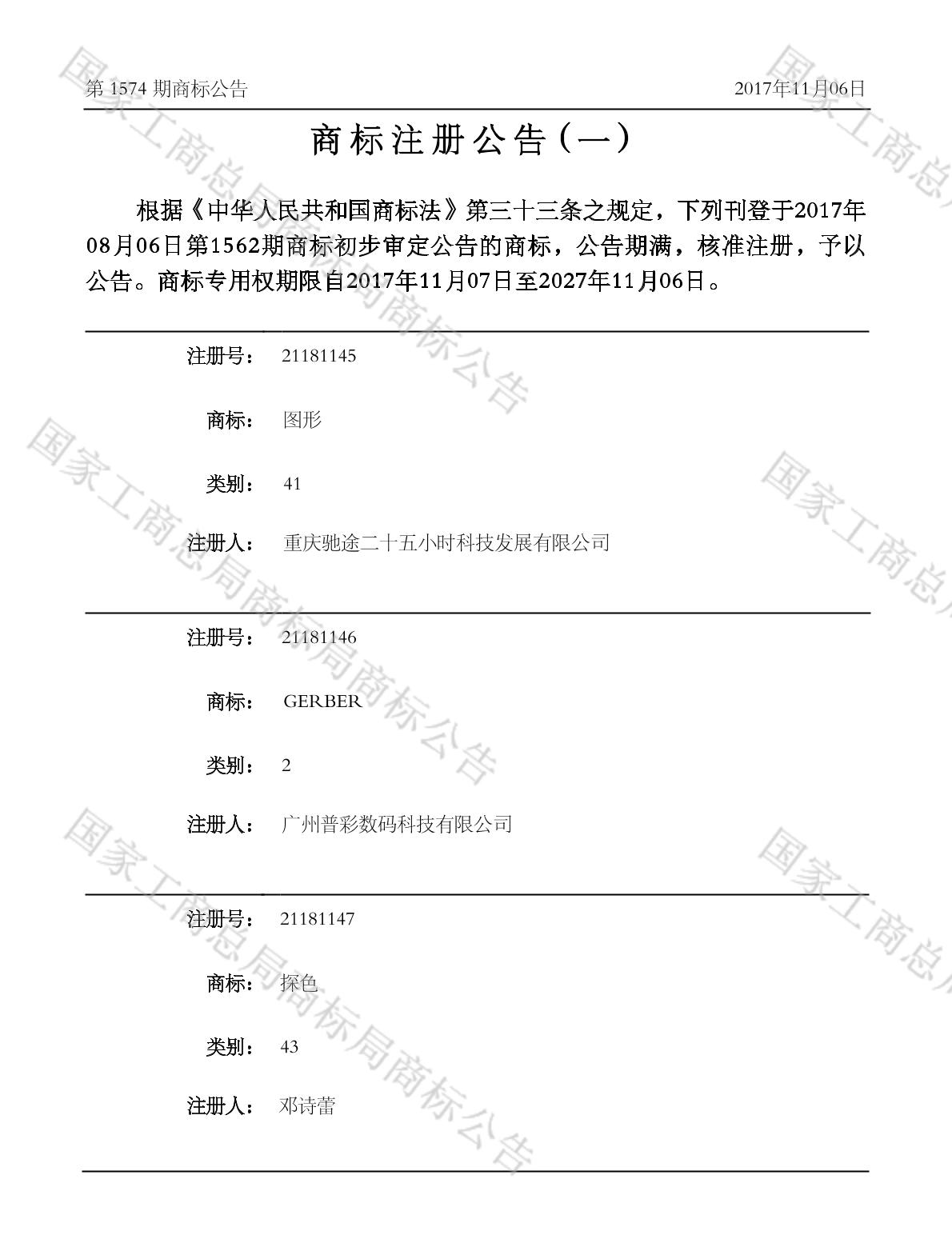 2017-12-05 商标注册申请 | 注册证发文