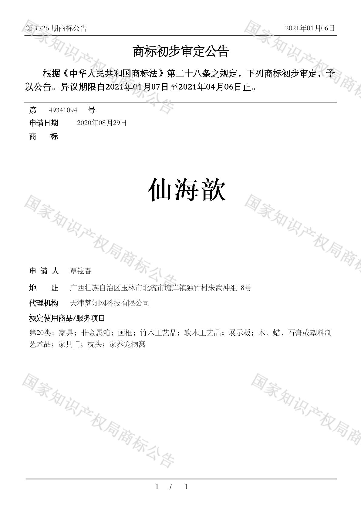 2001-家具;2002-非金属箱;2004-画框;2005-竹木工艺品;2006-木、蜡、石膏或塑料制艺术品;2006-软木工艺品;2007-展示板;2009-家养宠物窝;2012-家具门;2013-枕头 - 1726