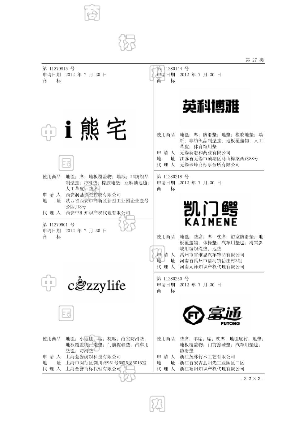 2701-地毯;2702-席;2703-人工草皮;2703-体育馆用垫;2703-地垫;2703-地板覆盖物;2703-橡胶地垫;2703-防滑垫;2704-墙纸;2704-非纺织品制壁挂 - 1377