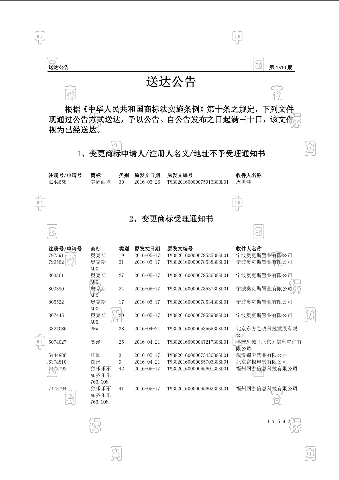 2016-07-07 商标注册申请 | 排版送达公告(商标注册证)