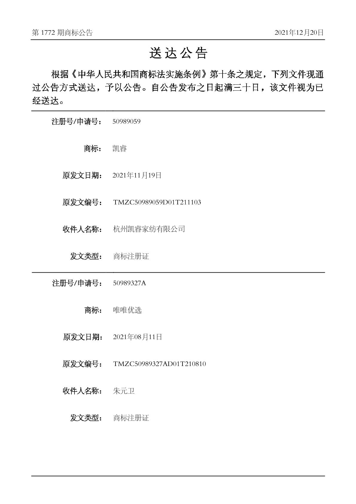2405-家庭日用纺织品;2405-纺织品毛巾;2406-家庭日用纺织品;2406-床单和枕套;2406-床罩;2406-枕巾;2406-毛巾被;2406-被子;2406-被罩;2407-家具遮盖物;2407-家庭日用纺织品;2407-非纸制桌旗 - 杭州凯睿家纺有限公司