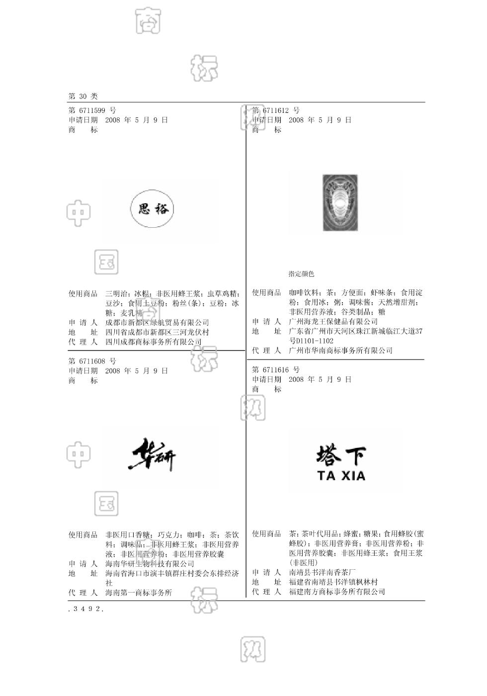 3001-咖啡;3002-茶;3002-茶饮料;3004-巧克力;3004-非医用口香糖;3005-非医用营养液;3005-非医用营养粉;3005-非医用营养胶囊;3005-非医用蜂王浆;3016-调味品 - 1198