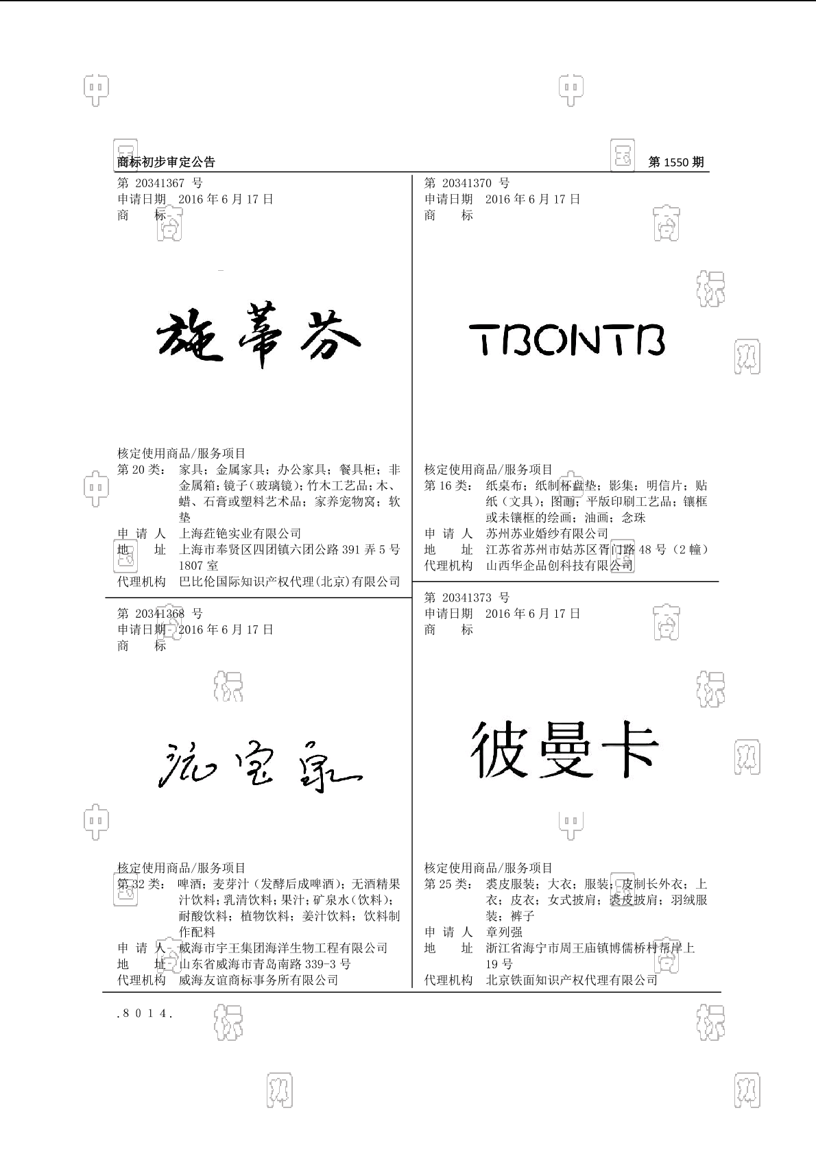 2001-办公家具;2001-家具;2001-金属家具;2001-餐具柜;2002-非金属箱;2004-镜子(玻璃镜);2005-竹木工艺品;2006-木、蜡、石膏或塑料艺术品;2009-家养宠物窝;2013-软垫 - 1550