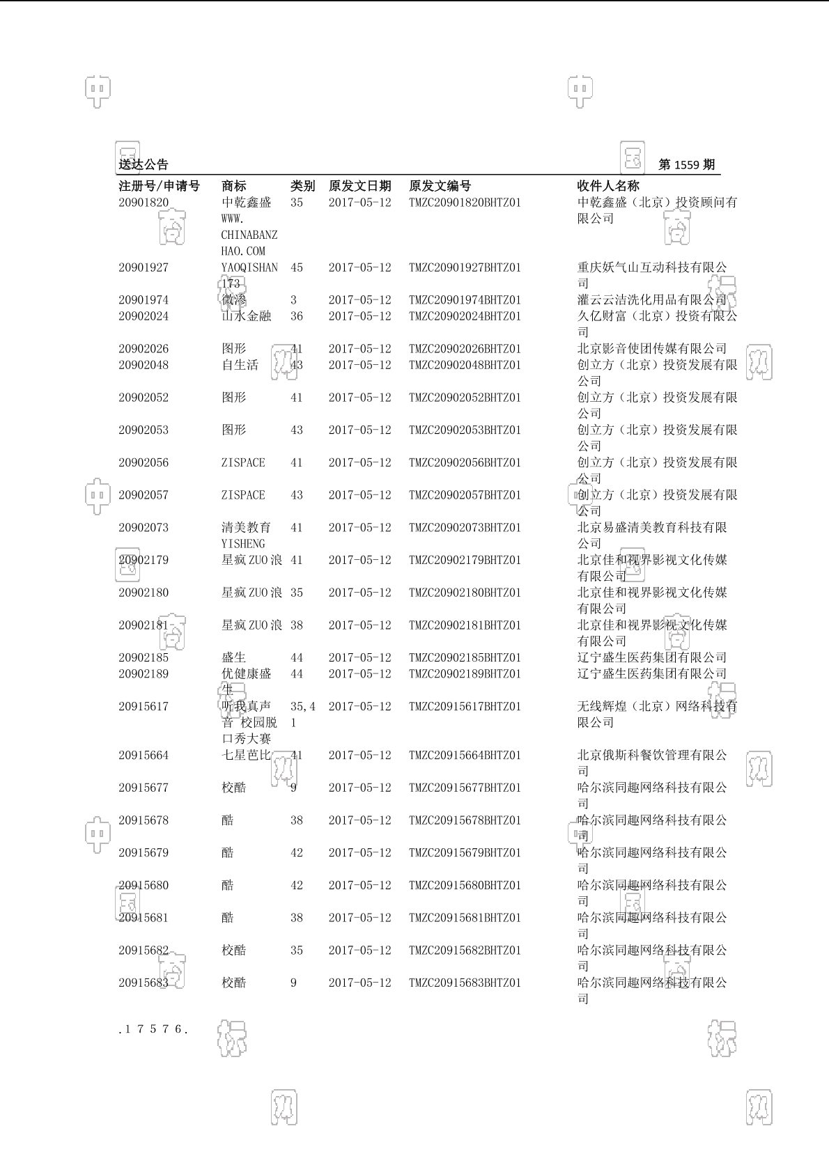2017-07-14 商标注册申请 | 排版送达公告(商标驳回通知书)