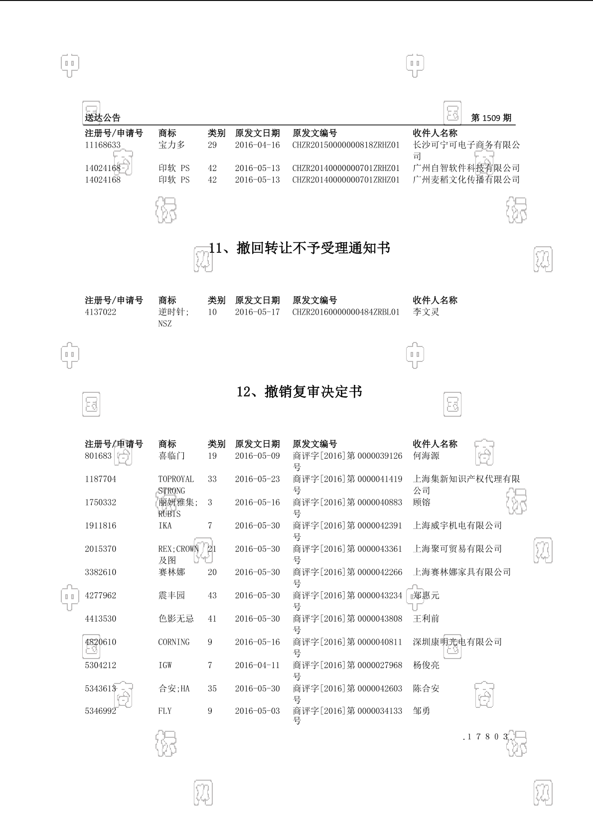 2016-11-19 撤销连续三年停止使用注册商标 | 等待受理通知书发文