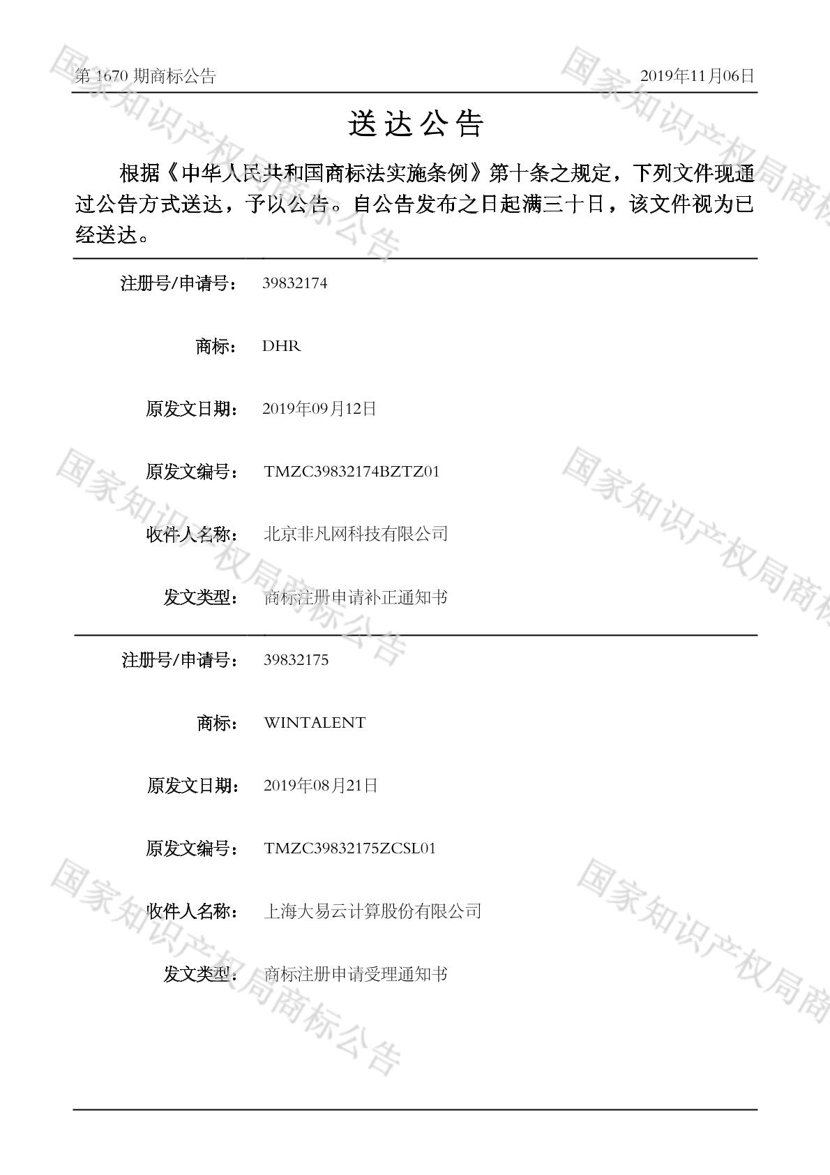 2019-11-06 商标注册申请 | 排版送达公告(商标注册申请受理通知书)