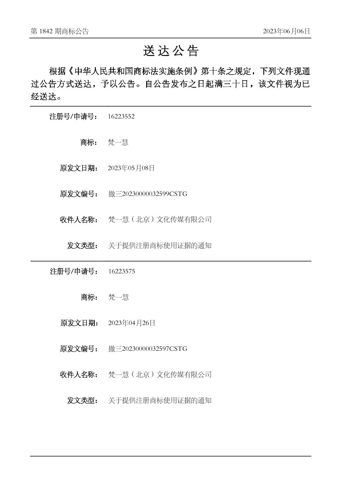 2023-06-06 撤销连续三年停止使用注册商标 | 排版送达公告(关于提供注册商标使用证据的通知)