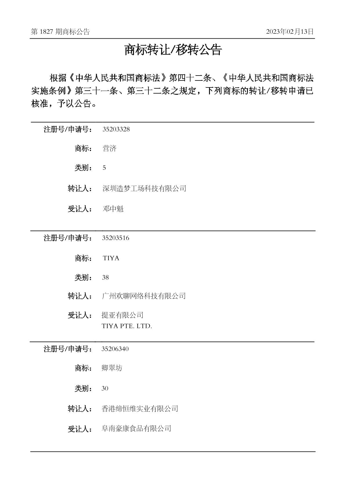 2023-02-16 商标转让 | 核准证明打印发送