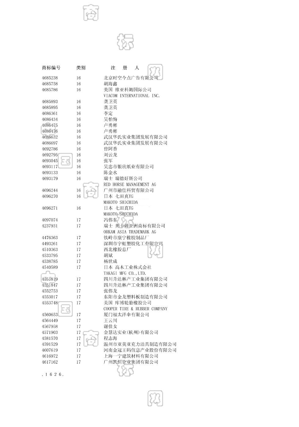 1601-纸;1603-纸巾;1605-印刷品;1605-平面图;1609-纸板盒或纸盒;1611-文具;1614-钢笔;1615-文具或家用粘合剂;1618-印板;1618-胶印板 - 1126