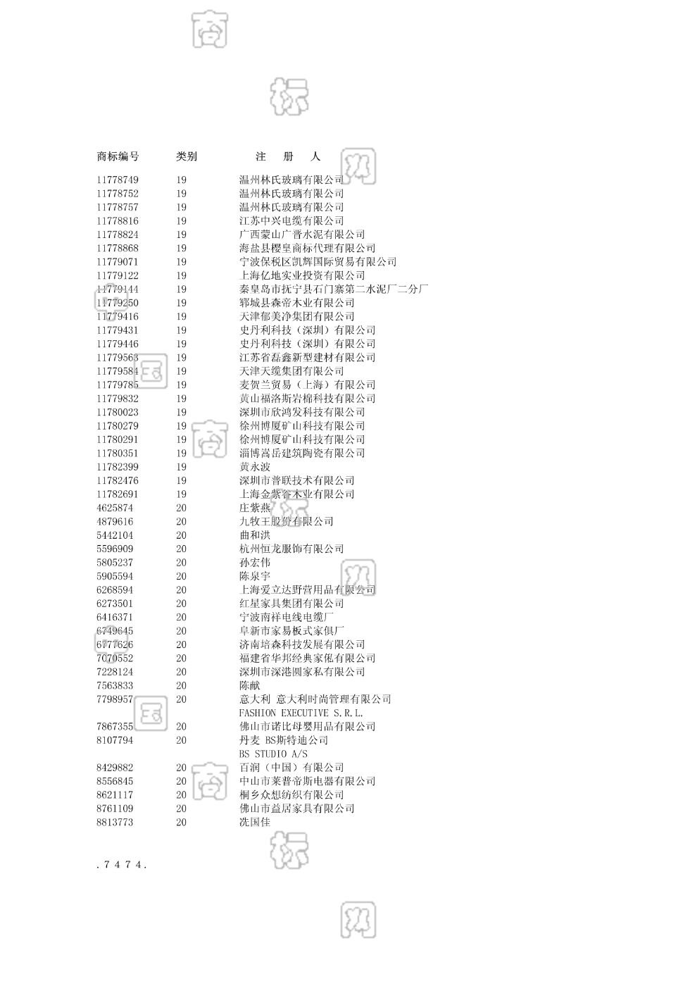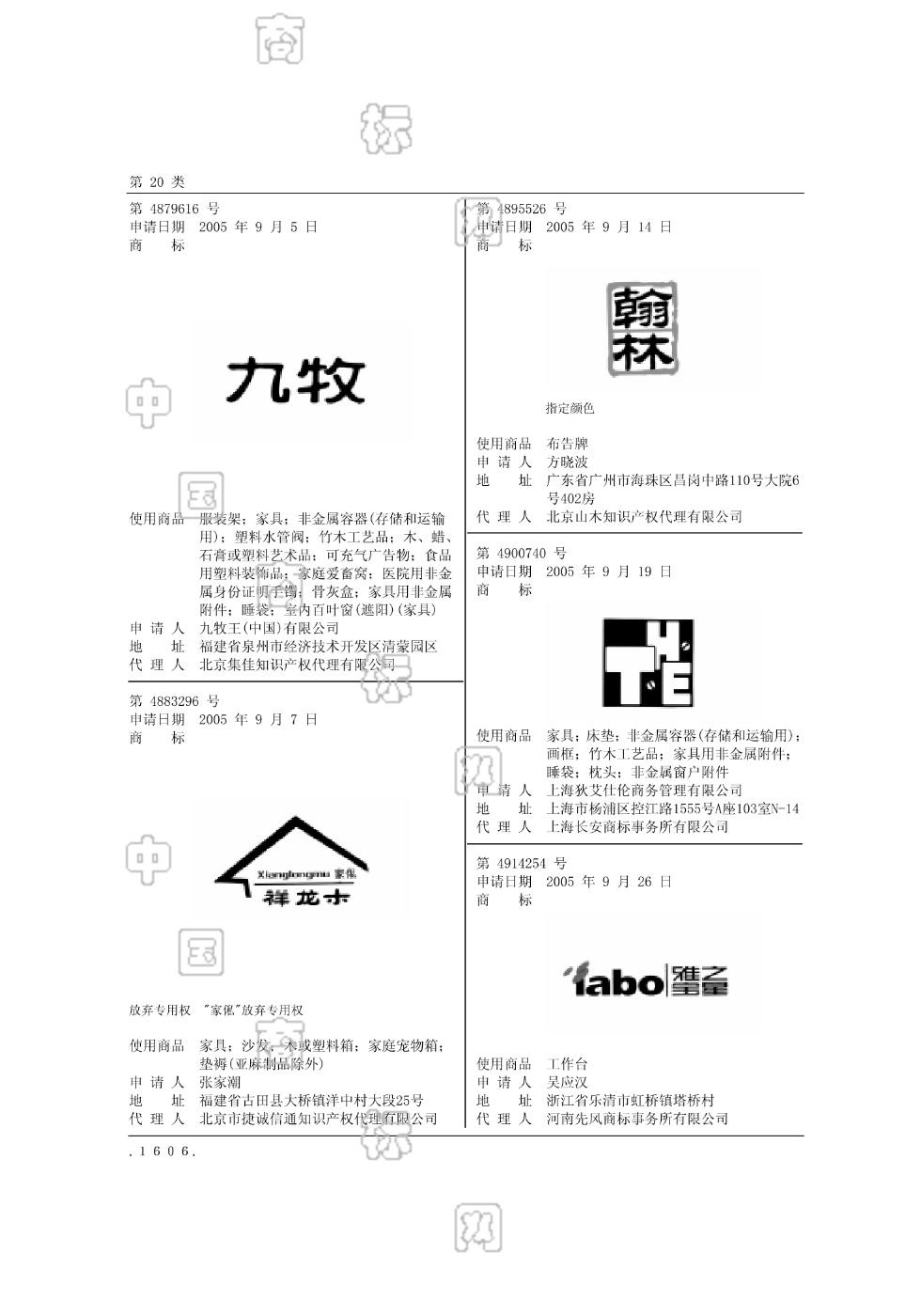 2001-家具;2001-服装架;2002-非金属容器(存储和运输用);2003-塑料水管阀;2004-画框;2005-竹木工艺品;2006-木、蜡、石膏或塑料艺术品;2007-可充气广告物;2008-食品用塑料装饰品;2009-家庭爱畜窝;2010-医院用非金属身份证明手镯;2011-骨灰盒;2012-家具用非金属附件;2013-睡袋;2014-室内百叶窗(遮阳)(家具) - 1152