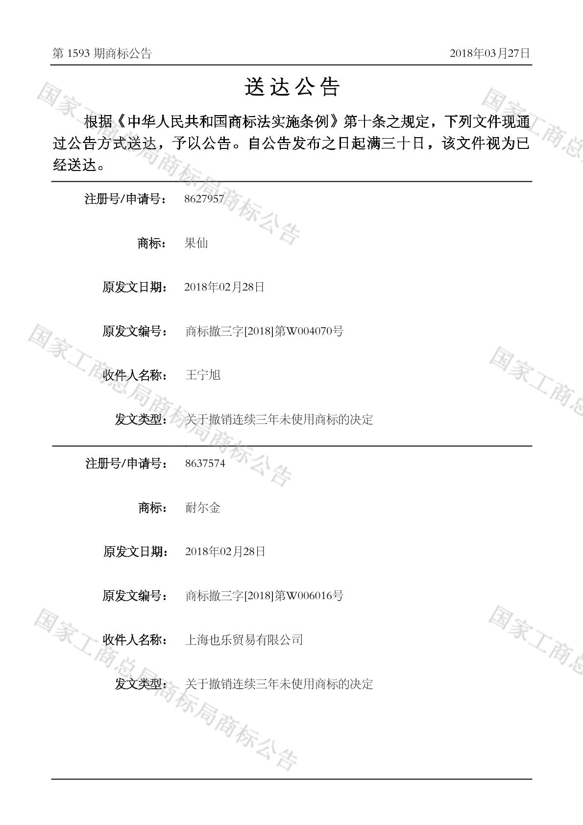 2018-04-05 撤销连续三年停止使用注册商标 | 排版送达公告(关于撤销连续三年未使用商标的决定)