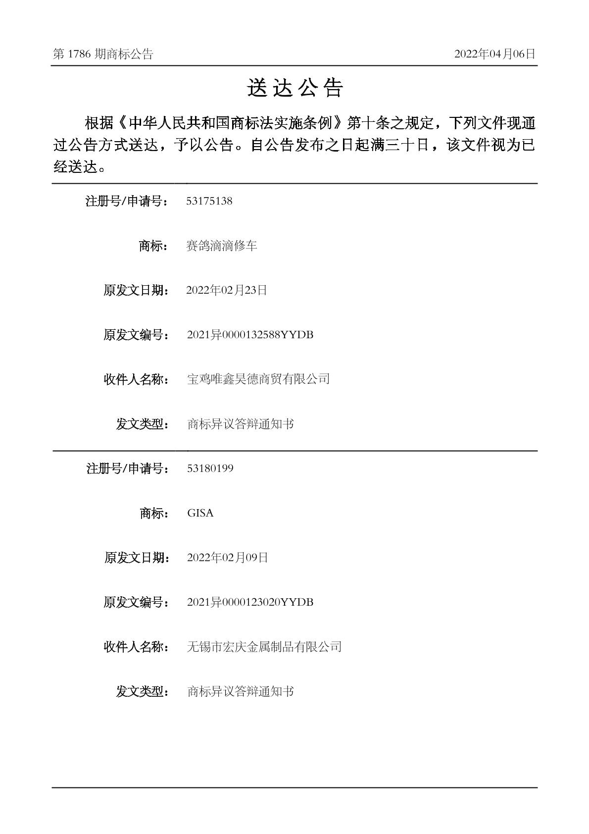 2022-04-06 商标异议申请 | 排版送达公告(商标异议答辩通知书)