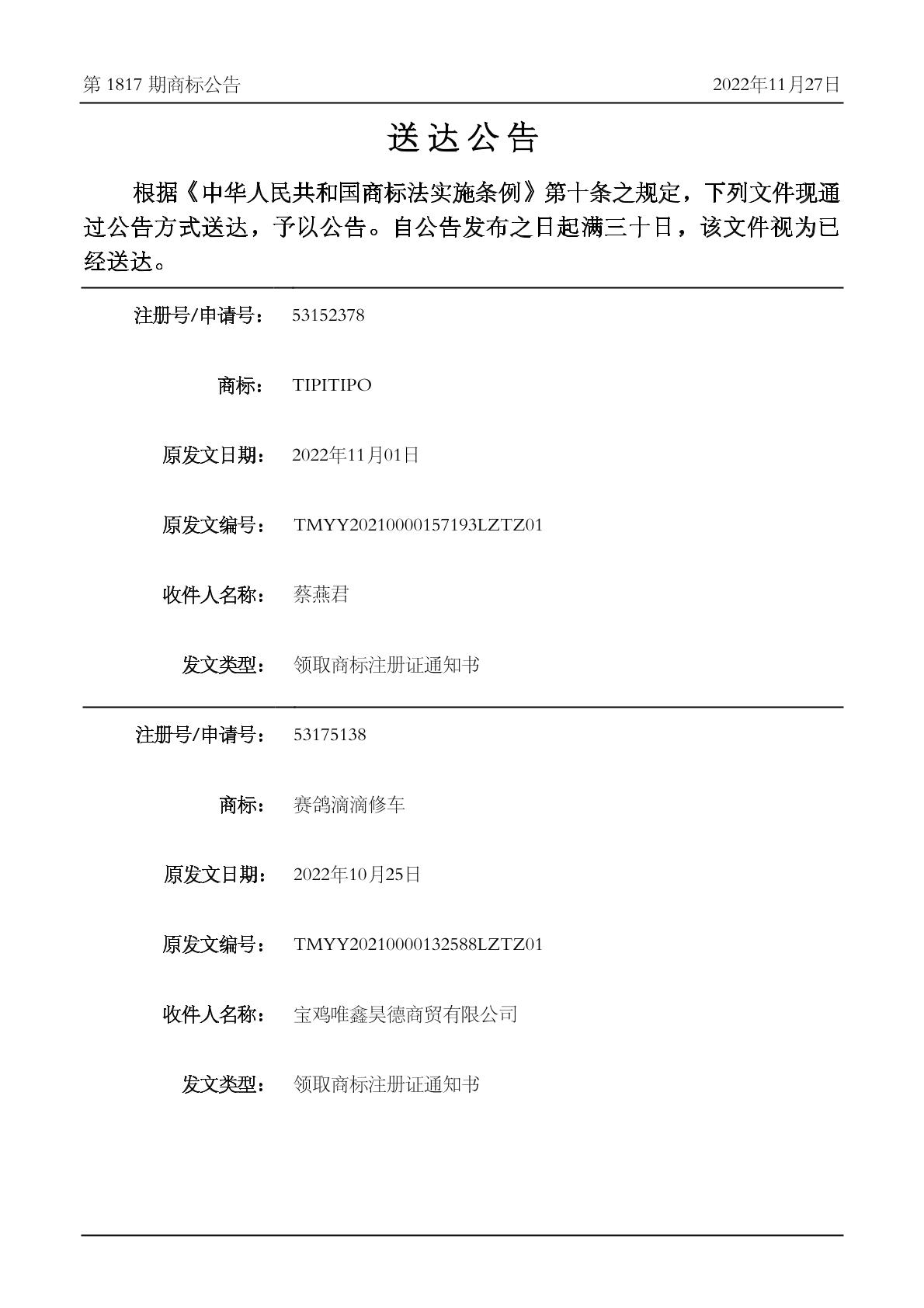 2022-11-28 商标异议申请 | 排版送达公告(领取商标注册证通知书)