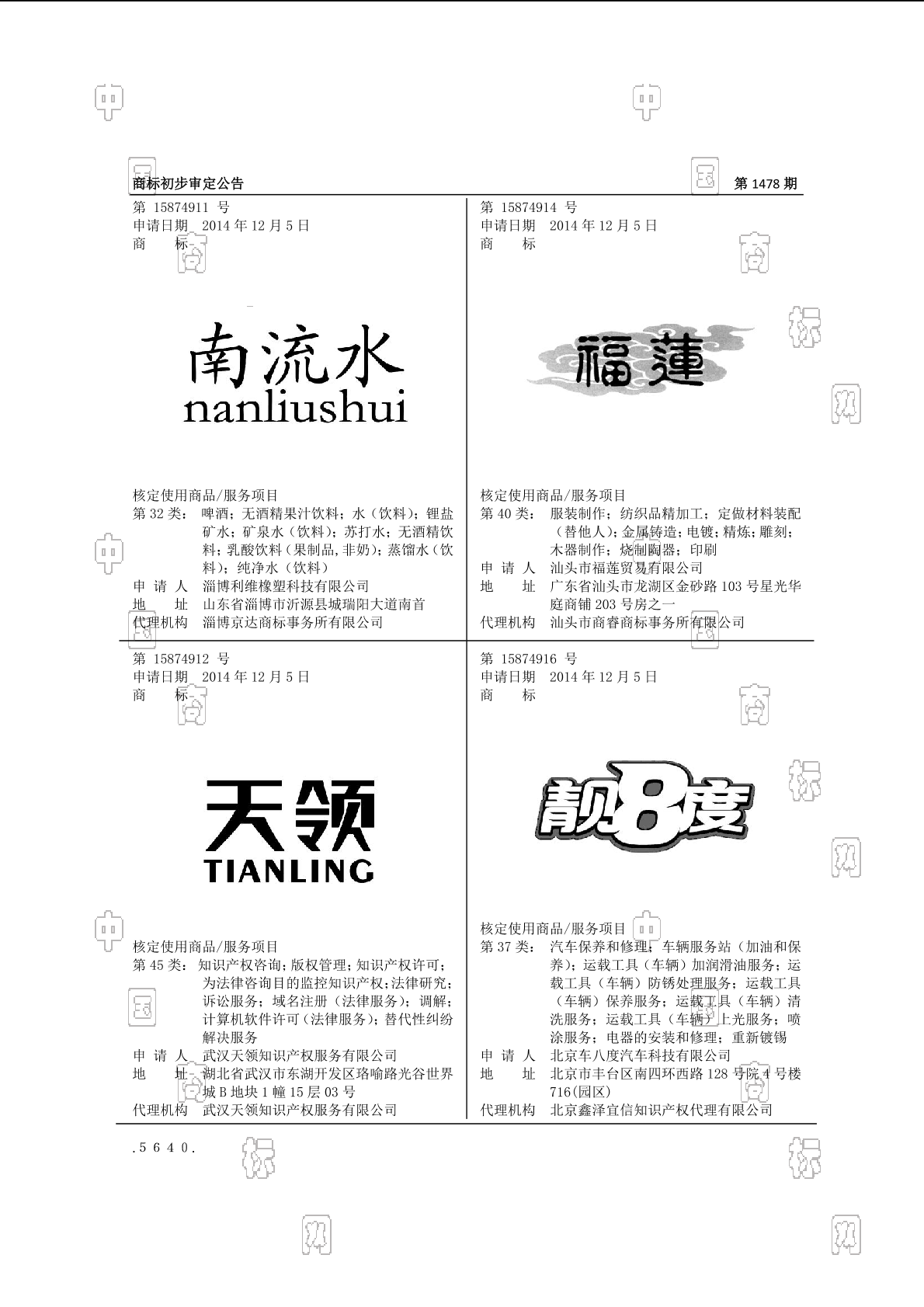 4001-定做材料装配(替他人);4002-电镀;4002-精炼;4002-金属铸造;4003-纺织品精加工;4004-木器制作;4007-烧制陶器;4010-服装制作;4011-印刷;4015-雕刻 - 1478