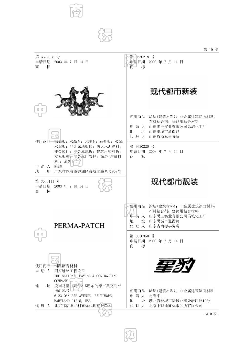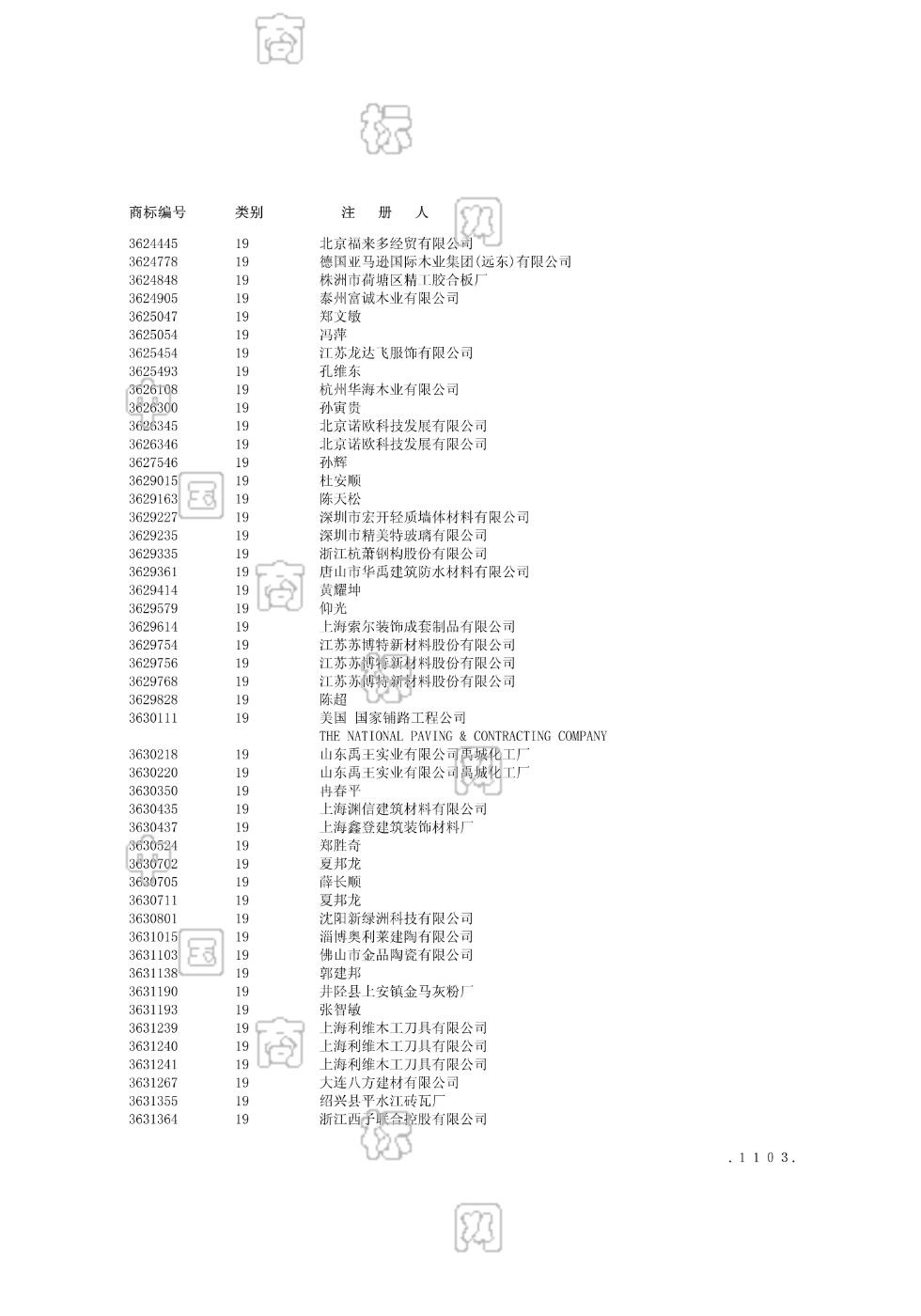 1901-贴面板;1902-大理石;1902-水晶石;1903-石膏板;1904-水泥;1905-水泥板;1906-非金属地板砖;1907-防火水泥涂料;1909-发光板材;1909-建筑用塑料板;1909-非金属地板;1909-非金属门;1910-非金属广告栏;1912-涂层(建筑材料);1915-墓碑 - 979