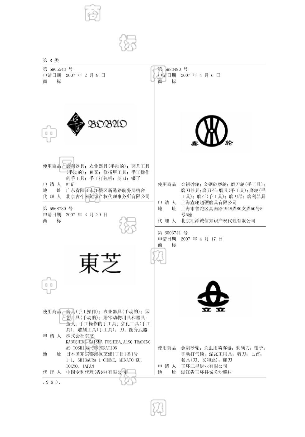 0801-金刚砂轮;0802-镰刀;0803-杀虫用喷雾器;0806-剃须刀;0807-钳子;0808- 手动打气筒;0809-泥瓦工用具;0810-剪刀;0811-匕首;0812-餐具(刀、叉和匙) - 1186