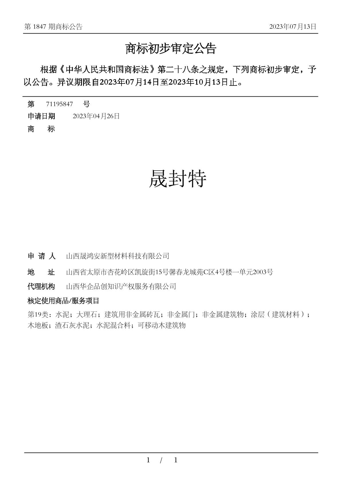 1901-木地板;1902-大理石;1904-水泥;1904-水泥混合料;1904-渣石灰水泥;1906-建筑用非金属砖瓦;1909-非金属门;1910-可移动木建筑物;1910-非金属建筑物;1912-涂层(建筑材料) - 1847