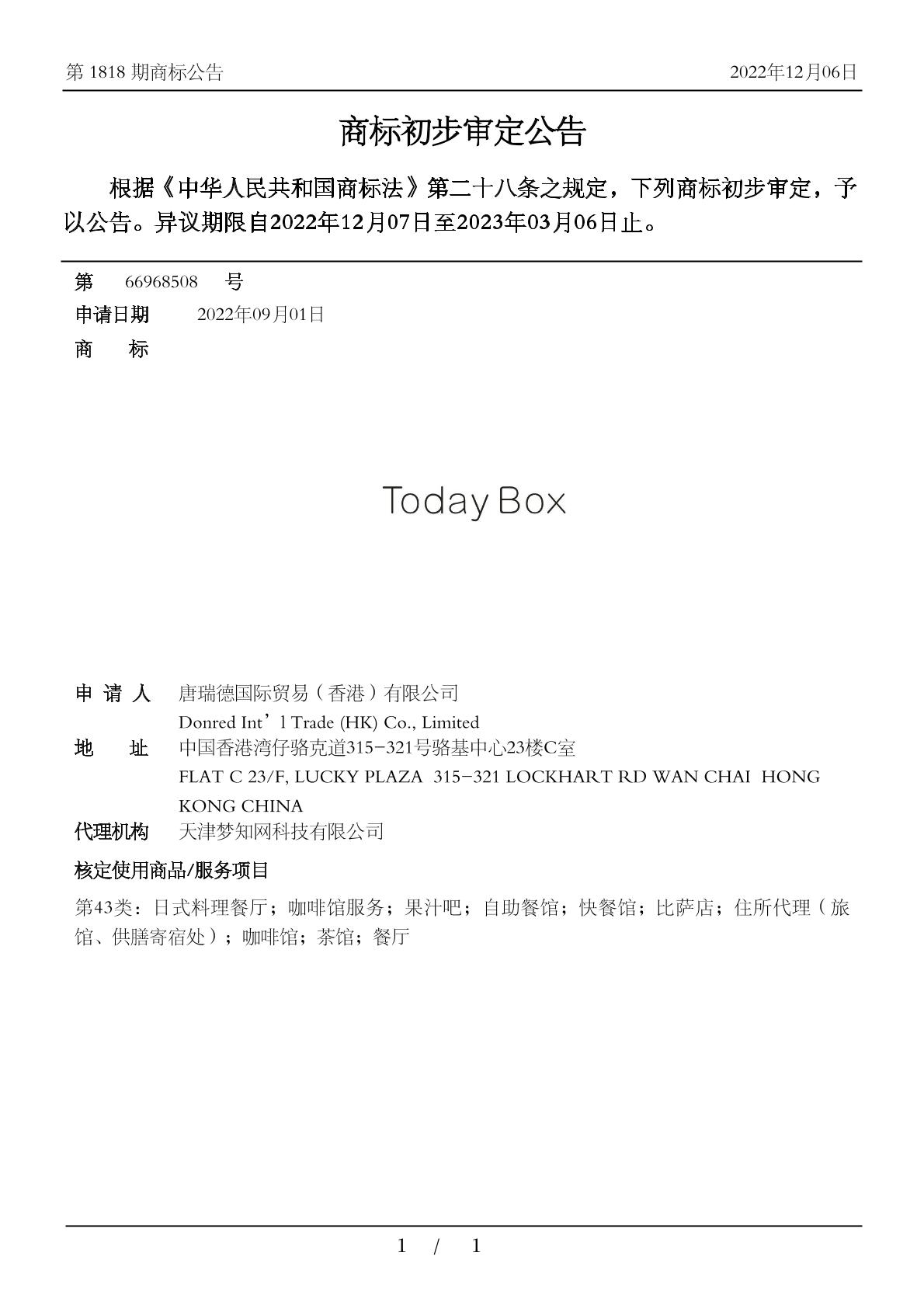 【TODAY BOX】商标详情
