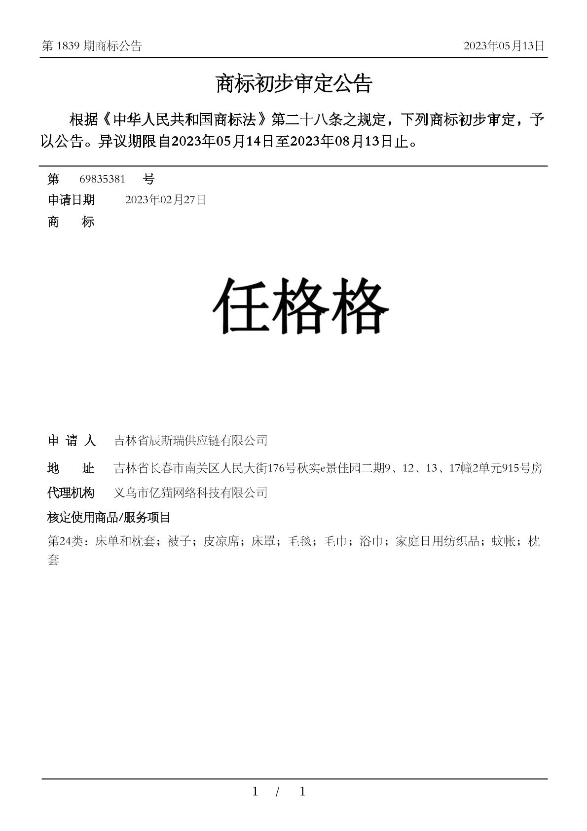 2405-家庭日用纺织品;2405-毛巾;2405-浴巾;2406-家庭日用纺织品;2406-床单和枕套;2406-床罩;2406-枕套;2406-毛毯;2406-皮凉席;2406-蚊帐;2406-被子;2407-家庭日用纺织品 - 1839