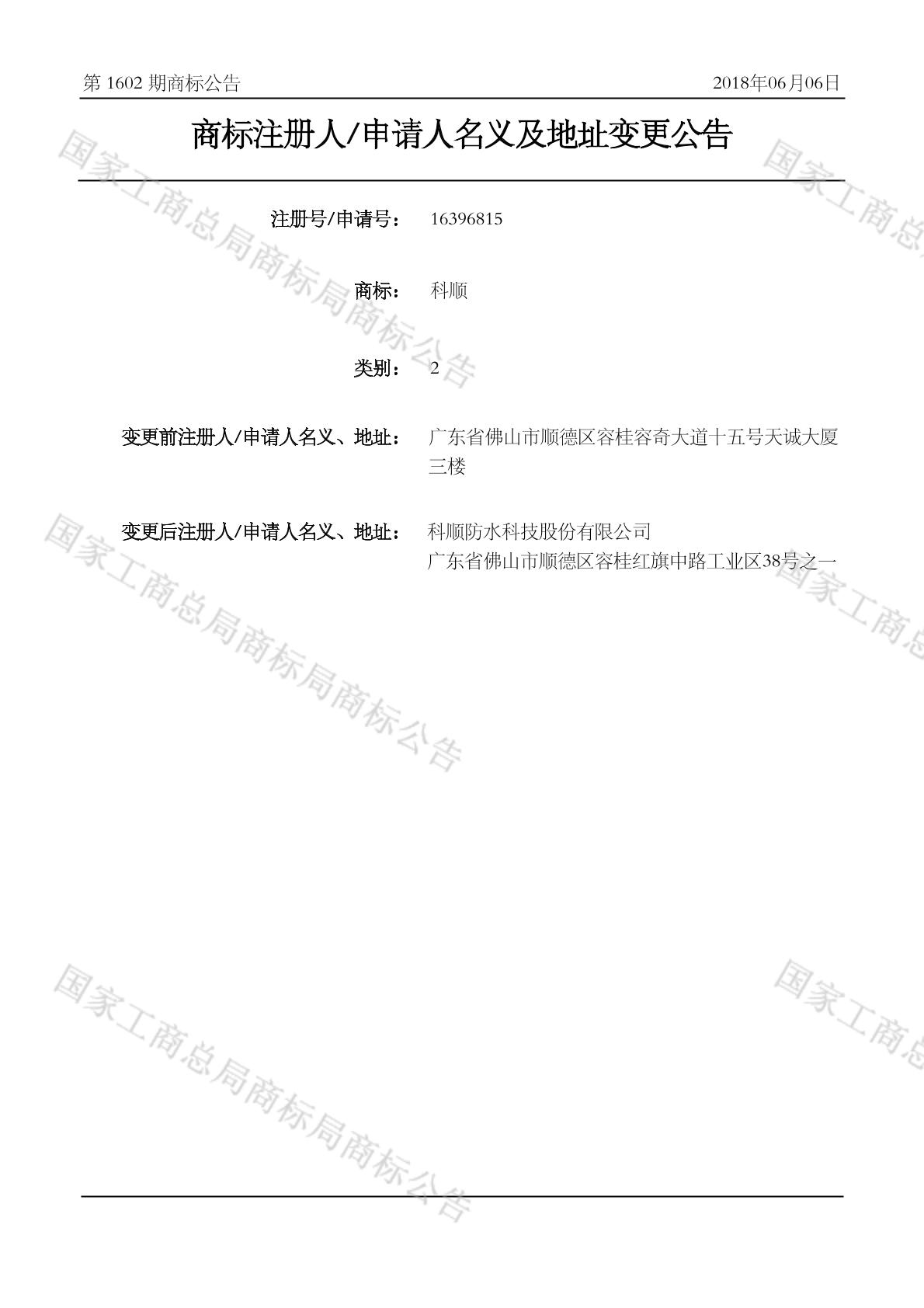 商标注册人申请人名义及地址变更公告 2018-06-06 第1602期 查看公告