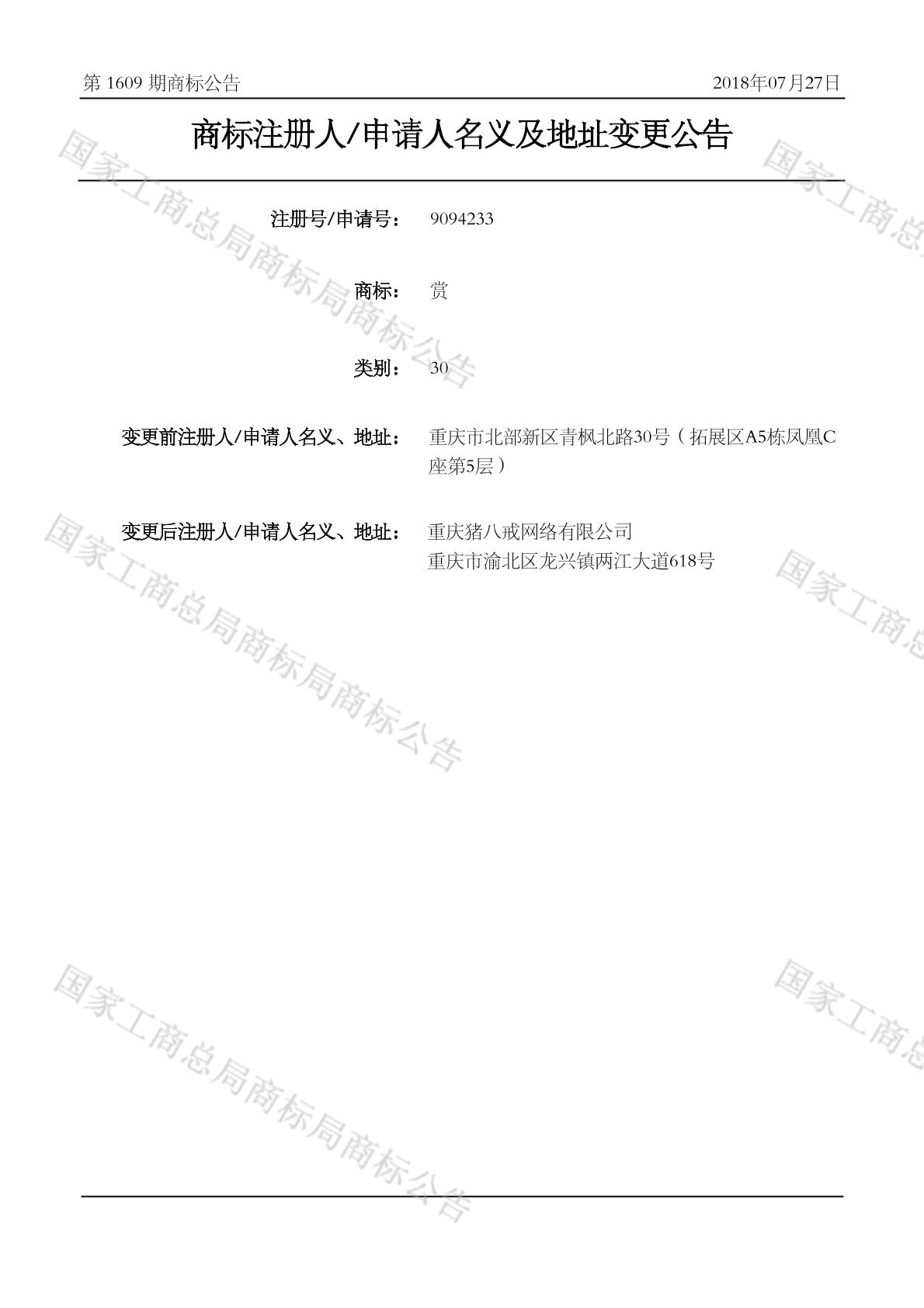 2018-02-01 变更商标申请人/注册人名义/地址 | 核准证明打印发送