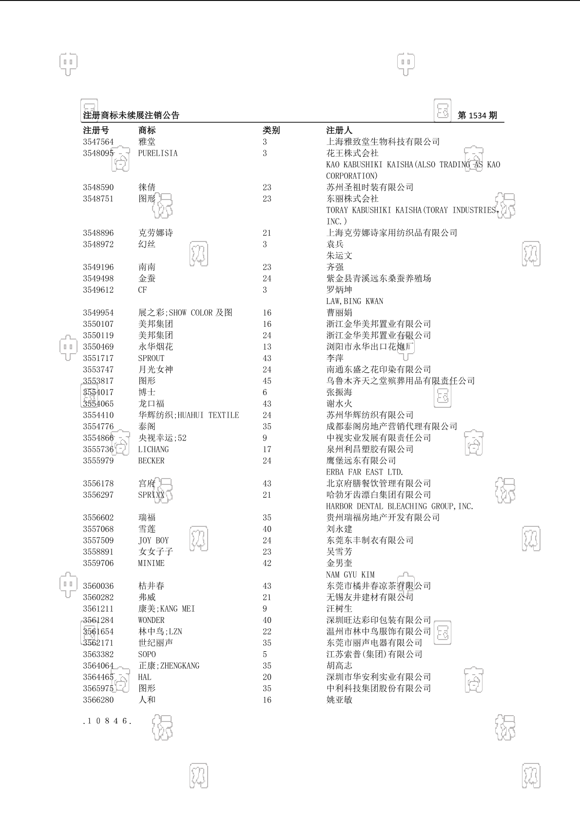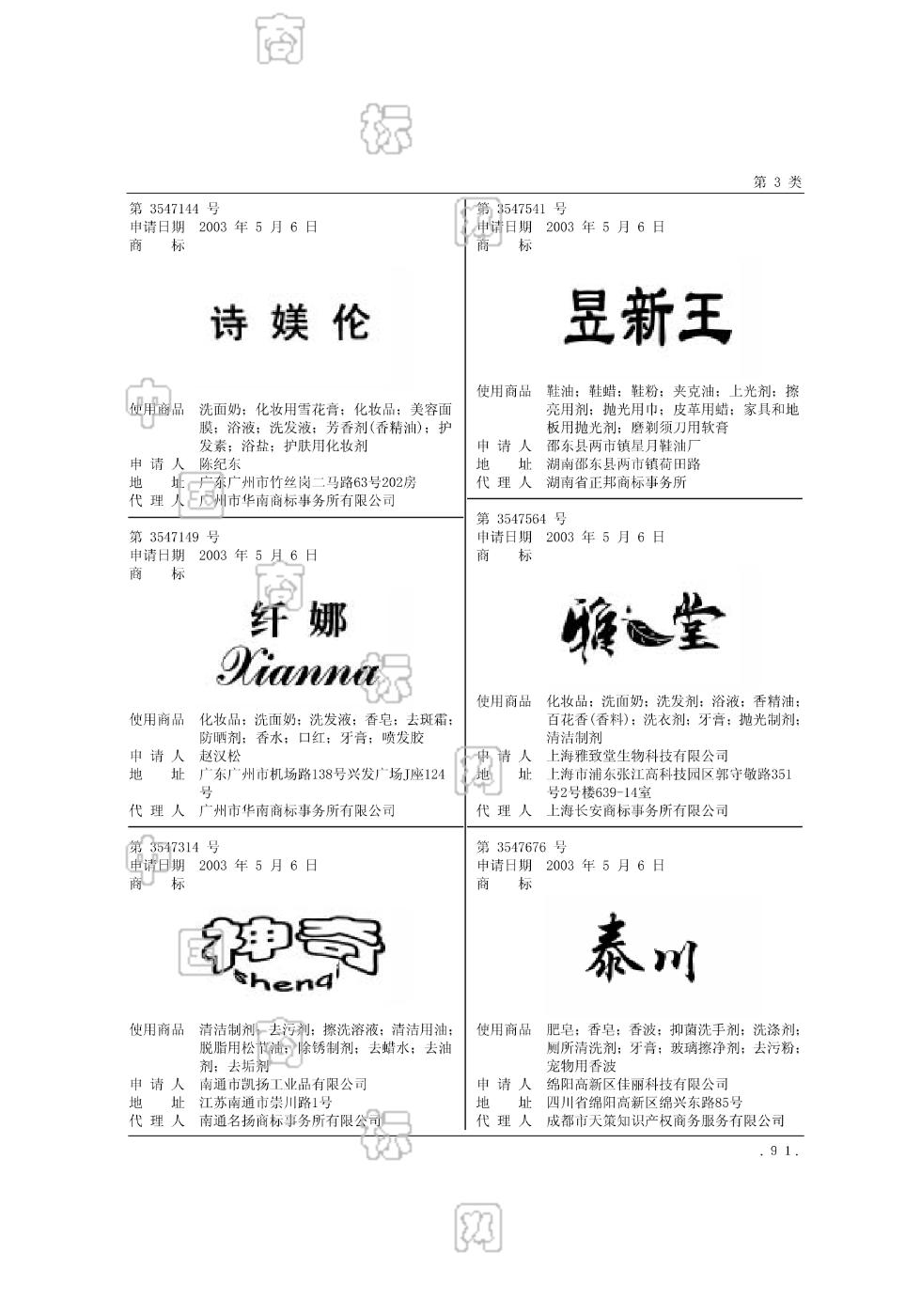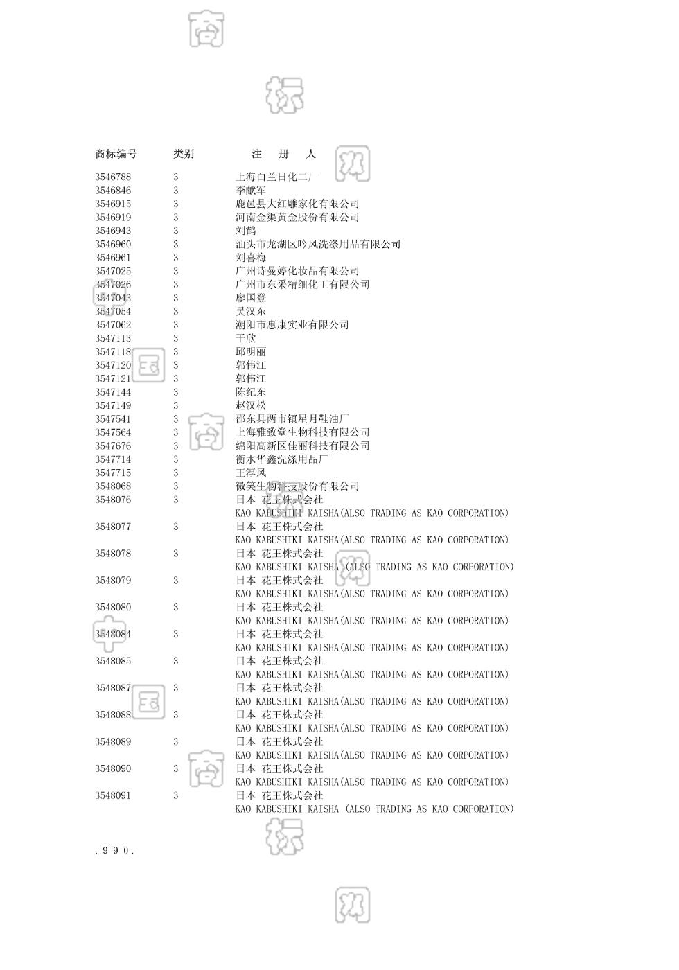 0301-洗发剂;0301-洗衣剂;0301-洗面奶;0301-浴液;0302-清洁制剂;0303-抛光制剂;0305-香精油;0306-化妆品;0307-牙膏;0308-百花香(香料) - 968