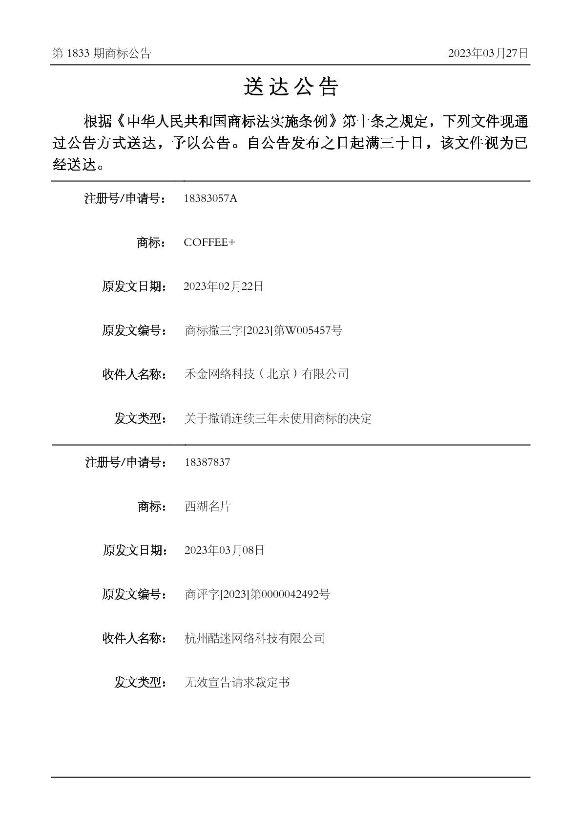 2023-03-28 撤销连续三年停止使用注册商标 | 排版送达公告(关于撤销连续三年未使用商标的决定)