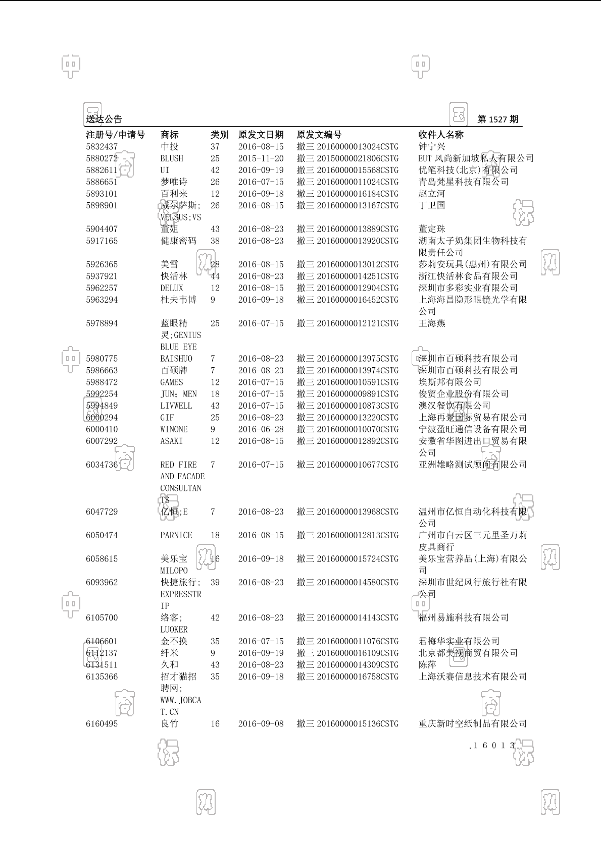 2016-09-28 撤销连续三年停止使用注册商标 | 等待受理通知书发文