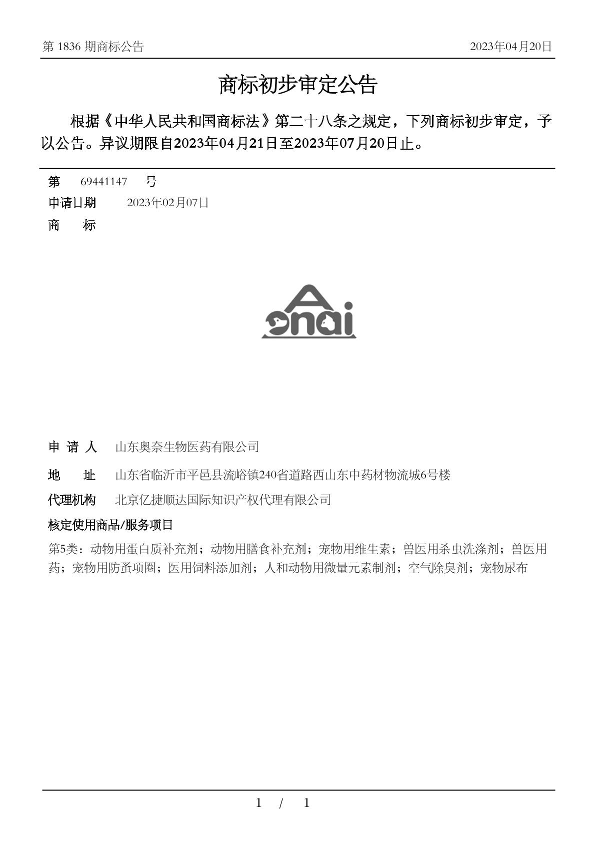 0501-人和动物用微量元素制剂;0503-空气除臭剂;0504-兽医用杀虫洗涤剂;0504-兽医用药;0504-动物用膳食补充剂;0504-动物用蛋白质补充剂;0504-医用饲料添加剂;0504-宠物用维生素;0504-宠物用防蚤项圈;0508-宠物尿布 - 1836