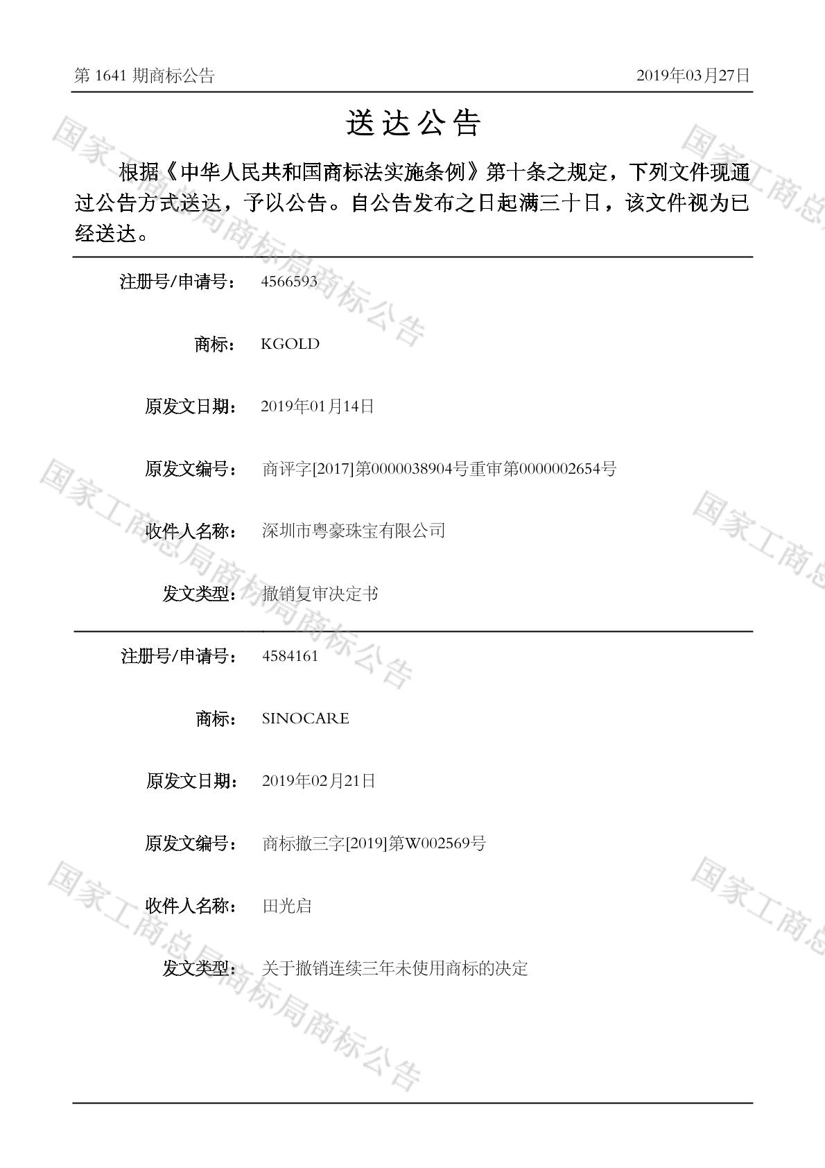 2019-03-27 撤销注册商标复审 | 排版送达公告(撤销复审决定书)