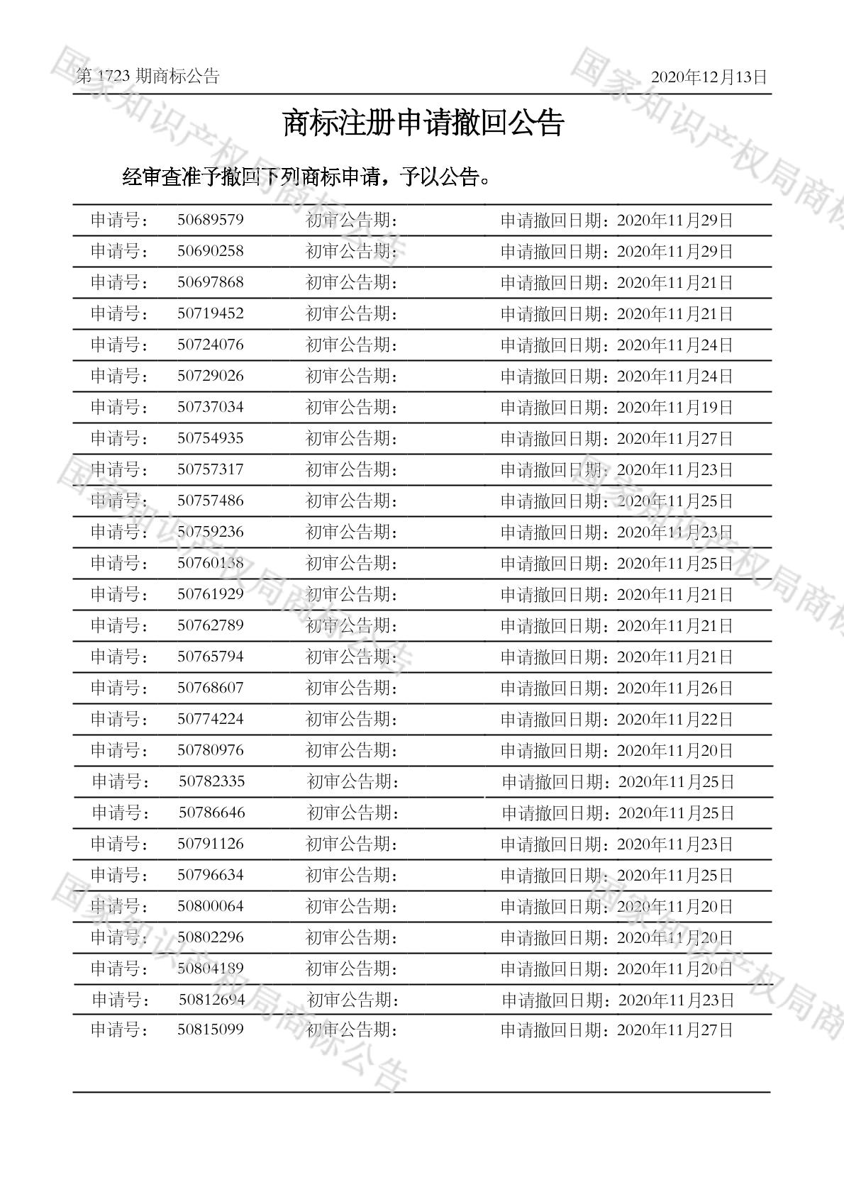 商标注册申请撤回公告 2020-12-13 第1723期 查看公告
