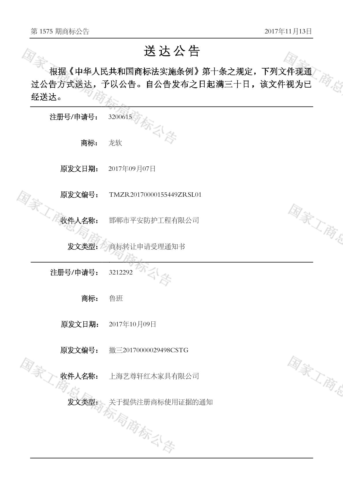 2017-12-05 撤销连续三年停止使用注册商标 | 排版送达公告(关于提供注册商标使用证据的通知)