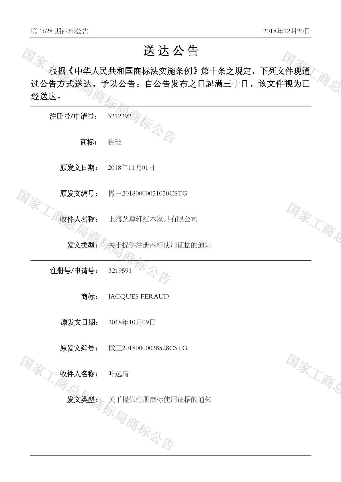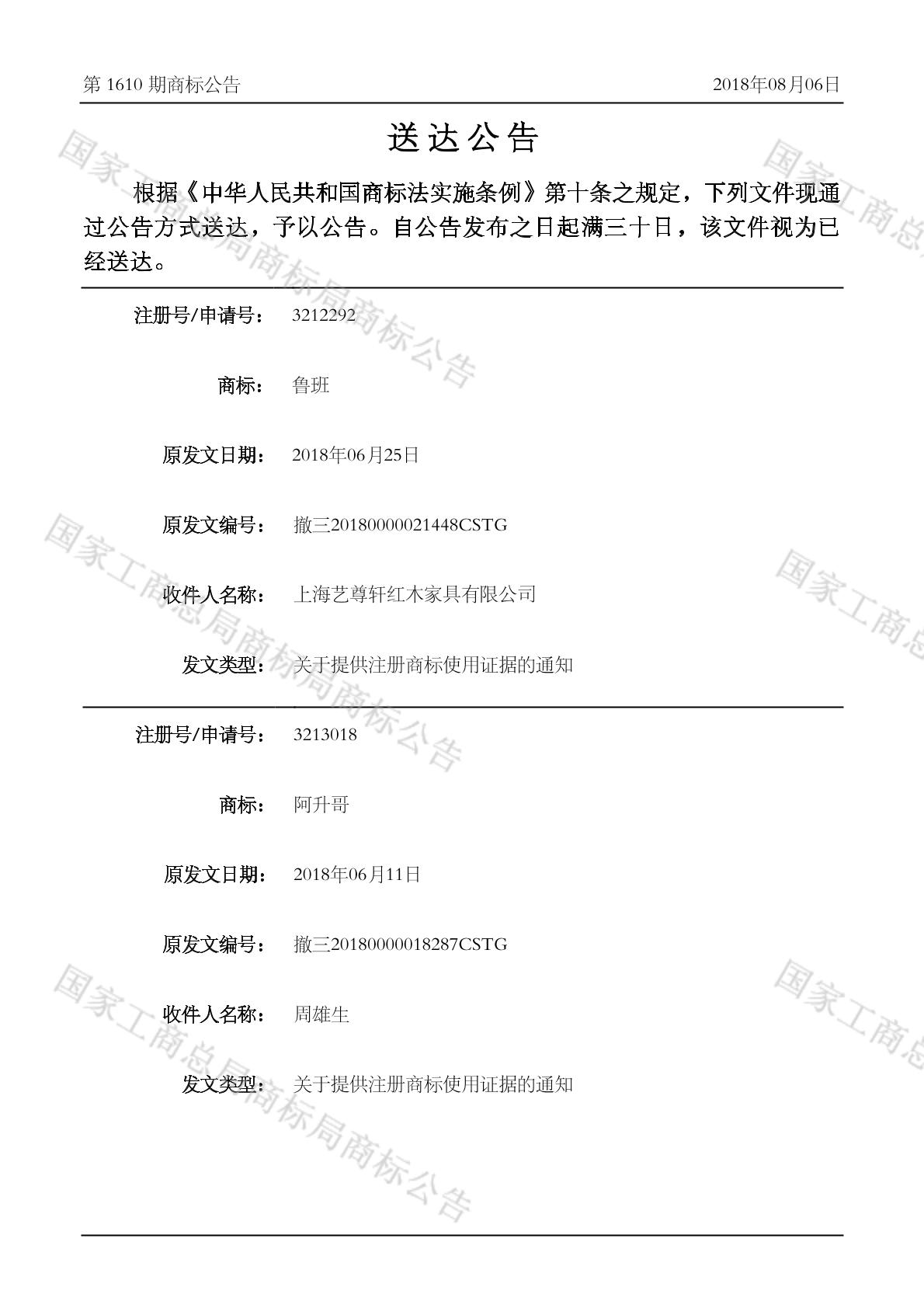 2018-08-06 撤销连续三年停止使用注册商标 | 排版送达公告(关于提供注册商标使用证据的通知)
