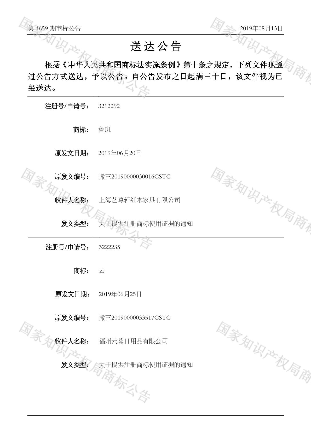 2019-09-23 撤销连续三年停止使用注册商标 | 排版送达公告(关于提供注册商标使用证据的通知)