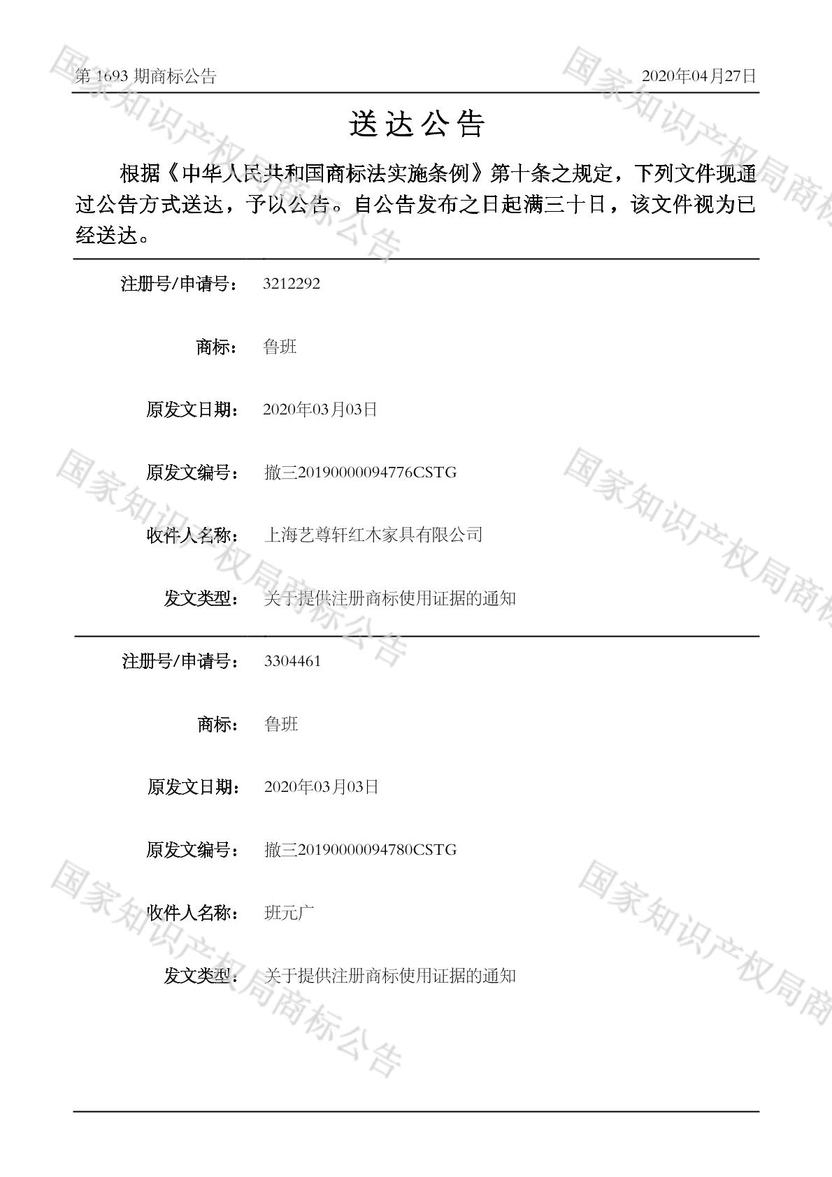 2020-04-26 撤销连续三年停止使用注册商标 | 排版送达公告(关于提供注册商标使用证据的通知)