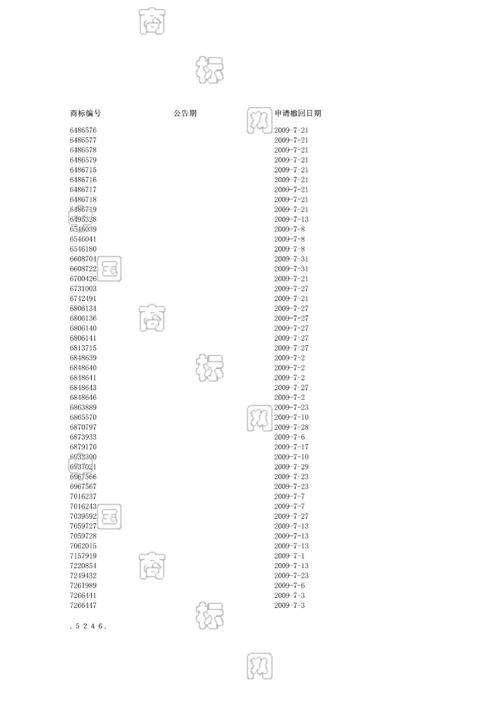 商标注册申请撤回公告 2009-11-06 第1190期 查看公告