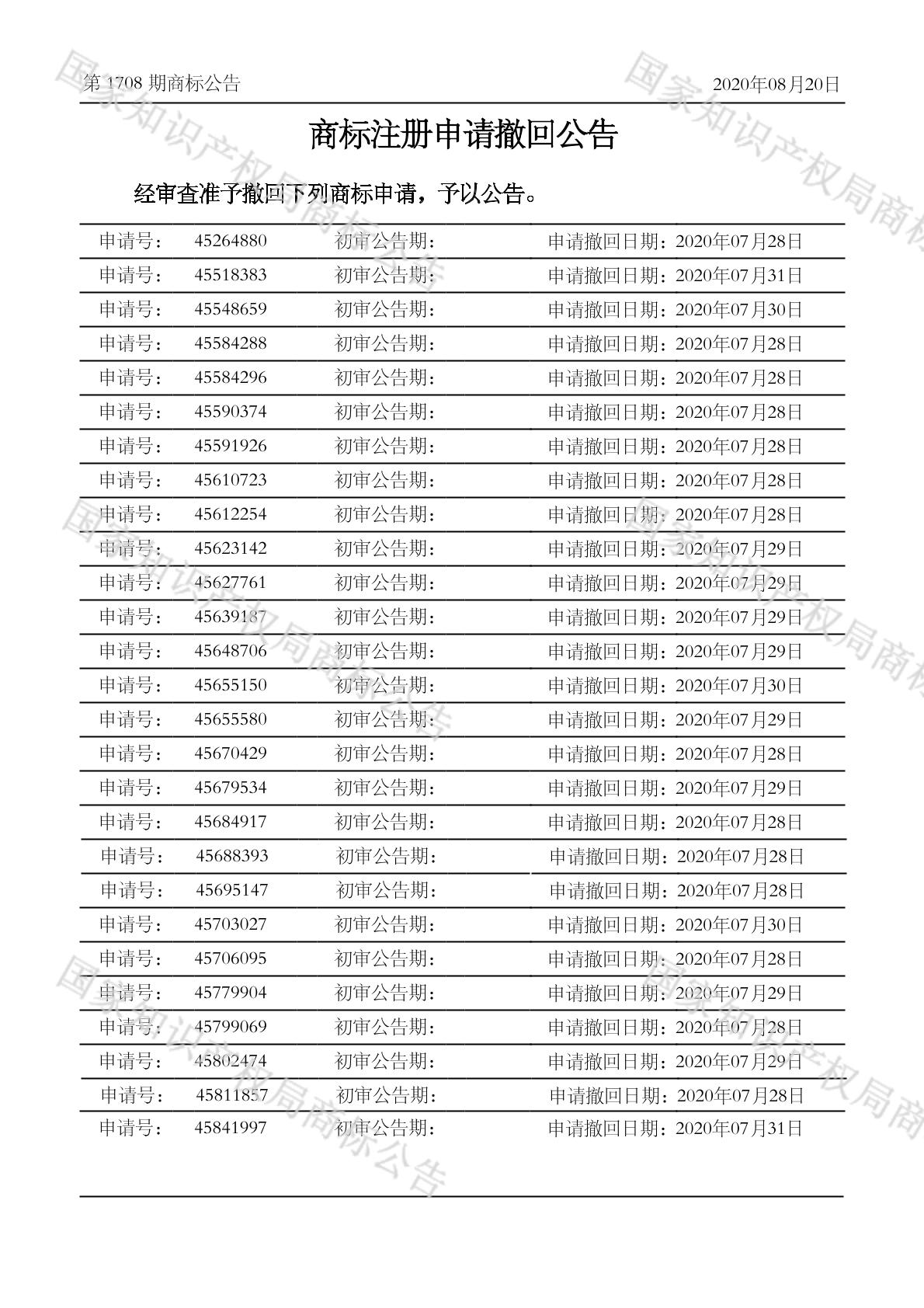 商标注册申请撤回公告 2020-08-20 第1708期 查看公告