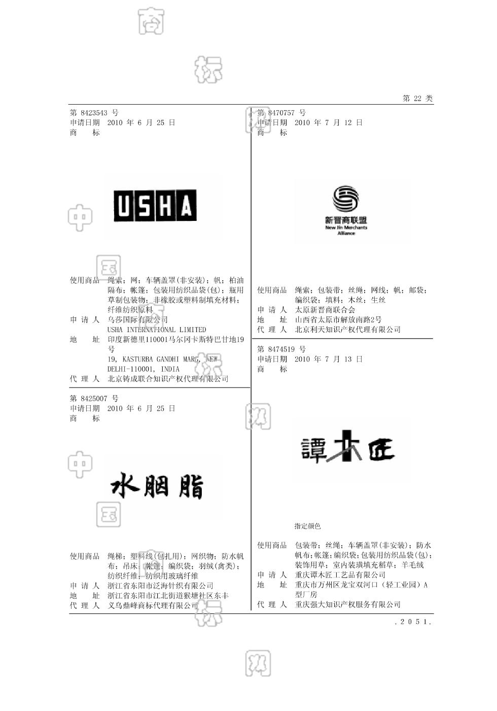 2201-塑料线(包扎用);2201-绳梯;2202-吊床;2202-帐篷;2202-网织物;2202-防水帆布;2203-编织袋;2204-羽绒(禽类);2205-纺织用玻璃纤维;2205-纺织纤维 - 1261