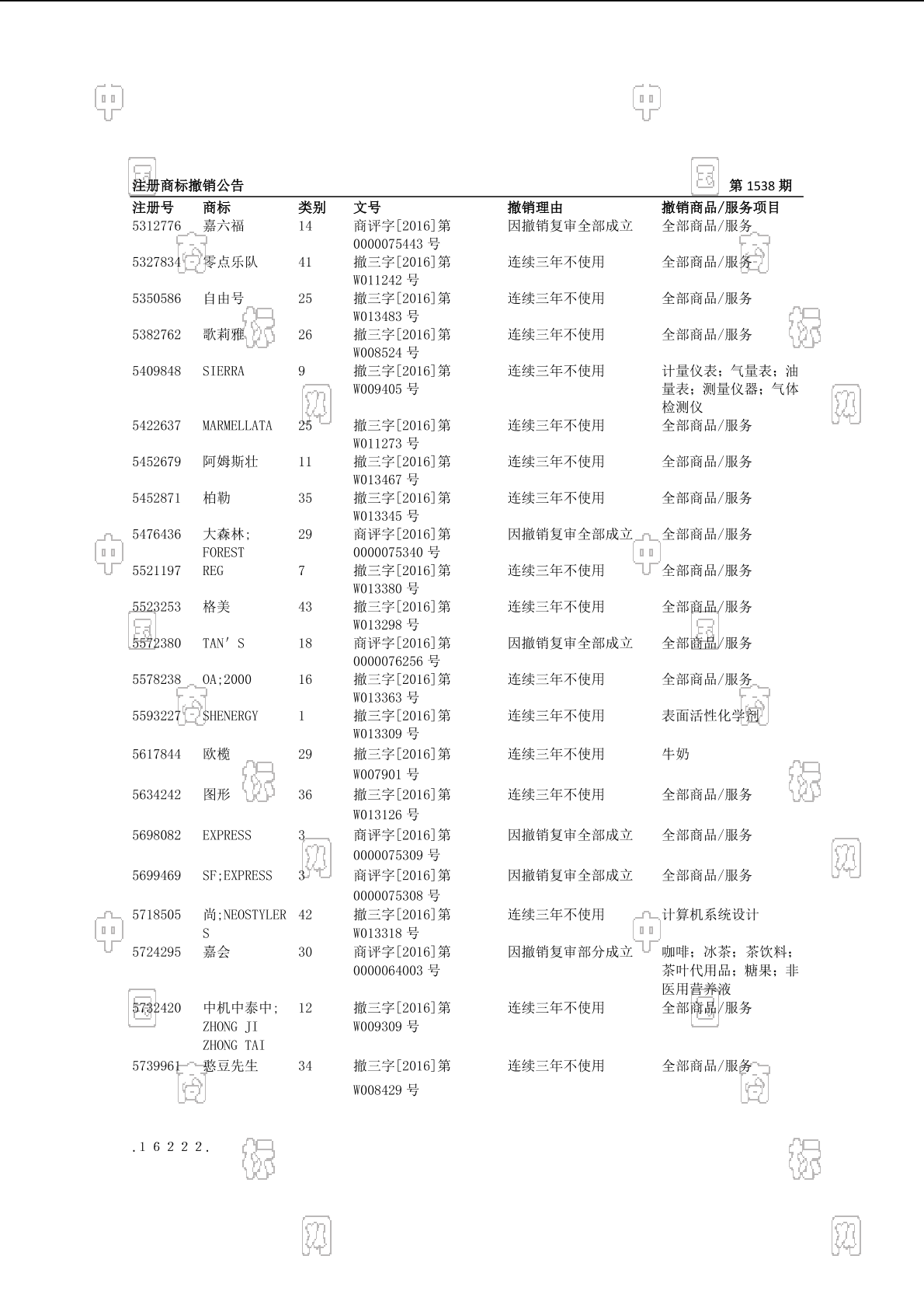 2016-11-17 撤销连续三年停止使用注册商标 | 撤销商标通知发文