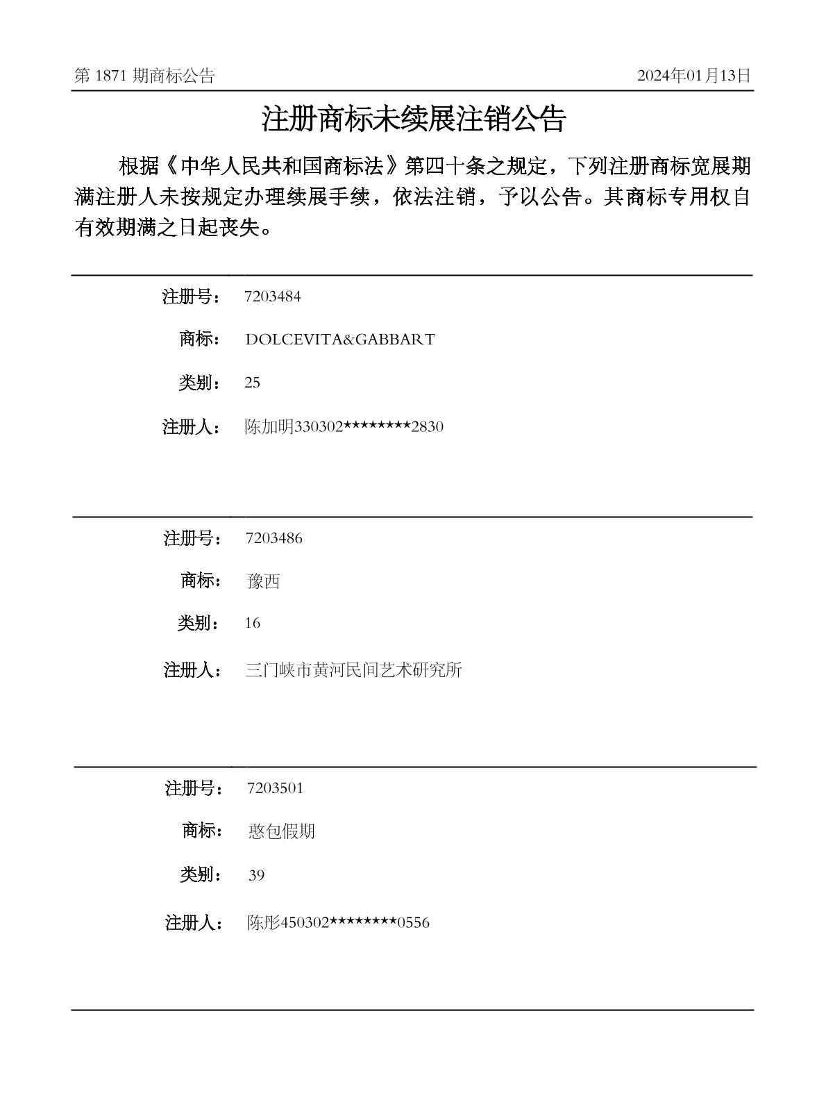 2024-01-15 期满未续展注销商标 | 排版未续展注销公告