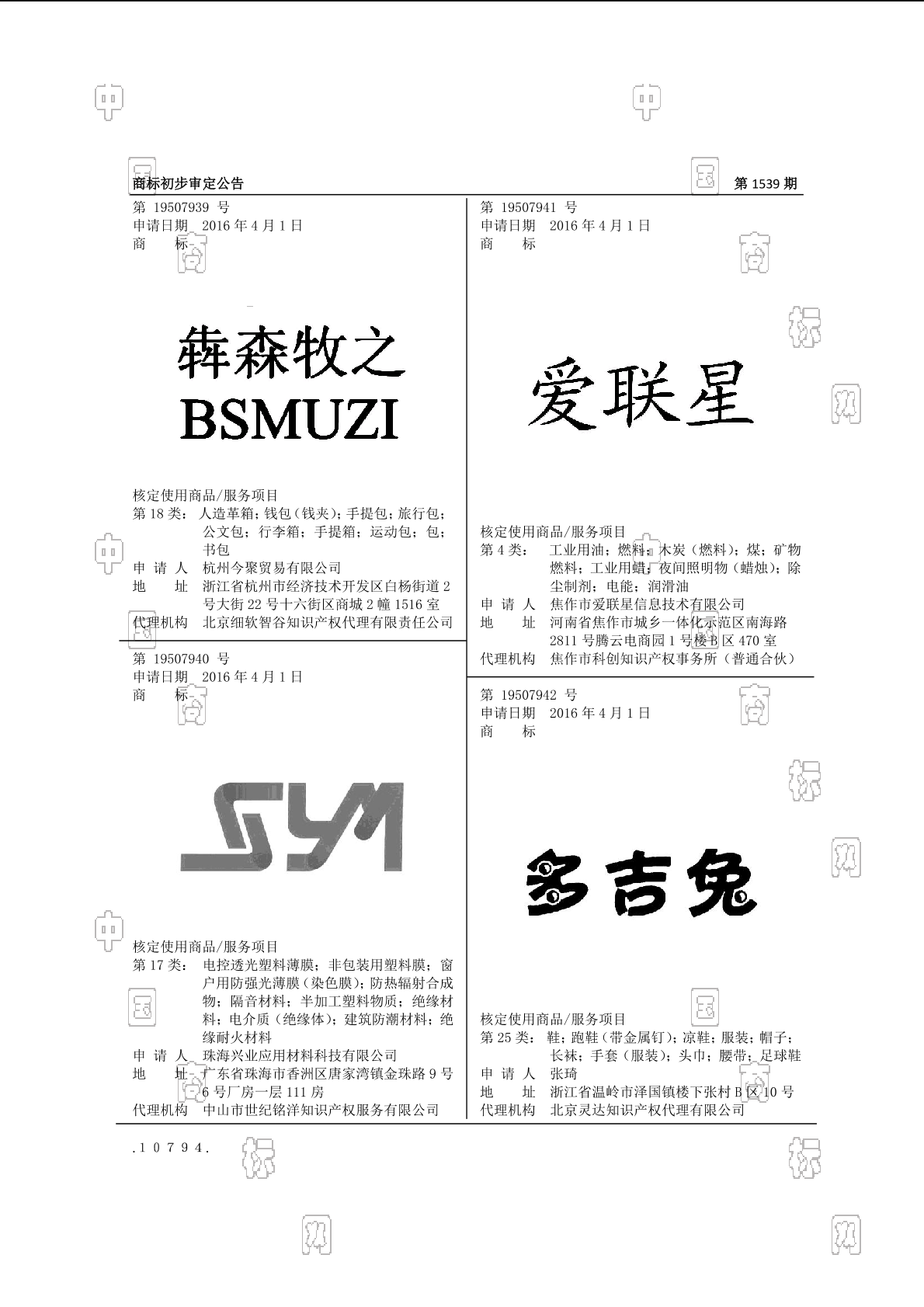0401-工业用油;0401-润滑油;0402-燃料;0403-木炭(燃料);0403-煤;0403-燃料;0403-矿物燃料;0404-工业用蜡;0405-夜间照明物(蜡烛);0406-除尘制剂;0407-电能 - 1539