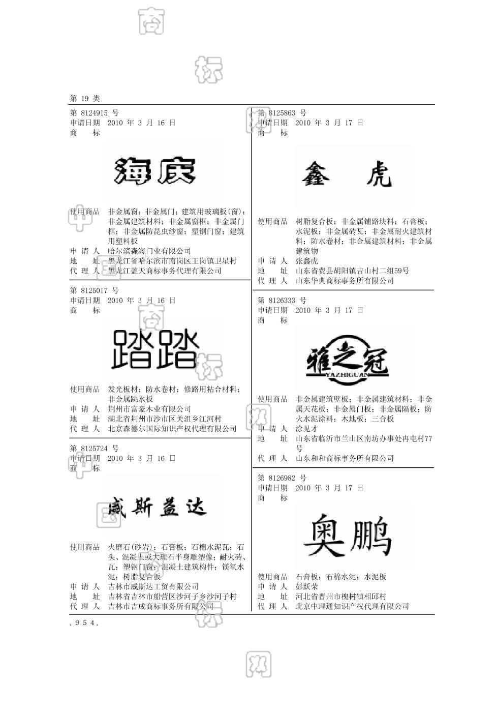 1901-三合板;1901-木地板;1907-防火水泥涂料;1909-建筑用塑料条;1909-建筑用塑料板;1909-非金属天花板;1909-非金属建筑壁板;1909-非金属建筑材料;1909-非金属门板;1909-非金属隔板 - 1252