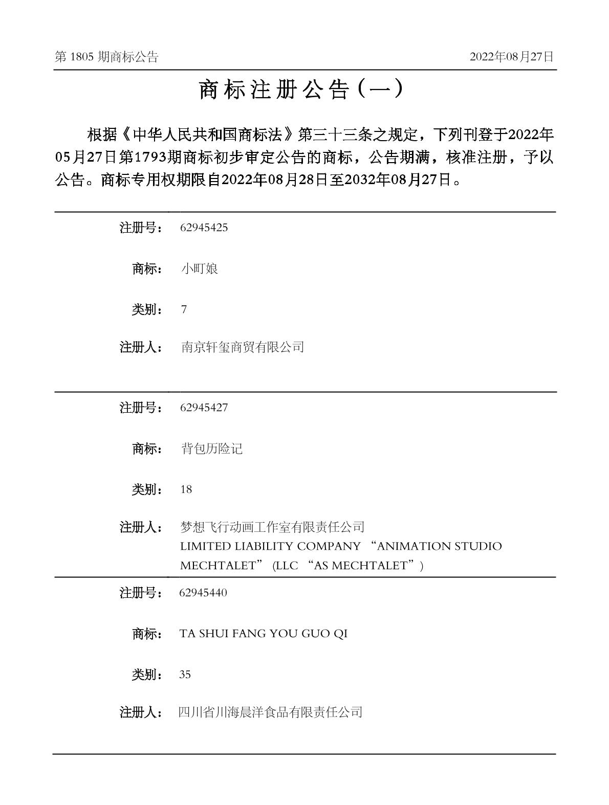 2022-09-21 商标注册申请 | 注册证发文