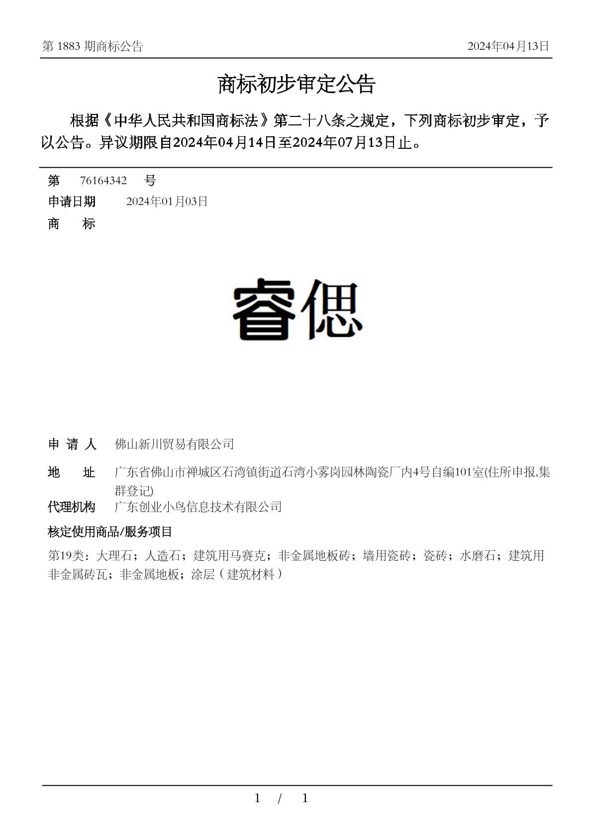 1902-人造石;1902-大理石;1906-墙用瓷砖;1906-建筑用非金属砖瓦;1906-建筑用马赛克;1906-水磨石;1906-瓷砖;1906-非金属地板砖;1909-非金属地板;1912-涂层(建筑材料) - 1883