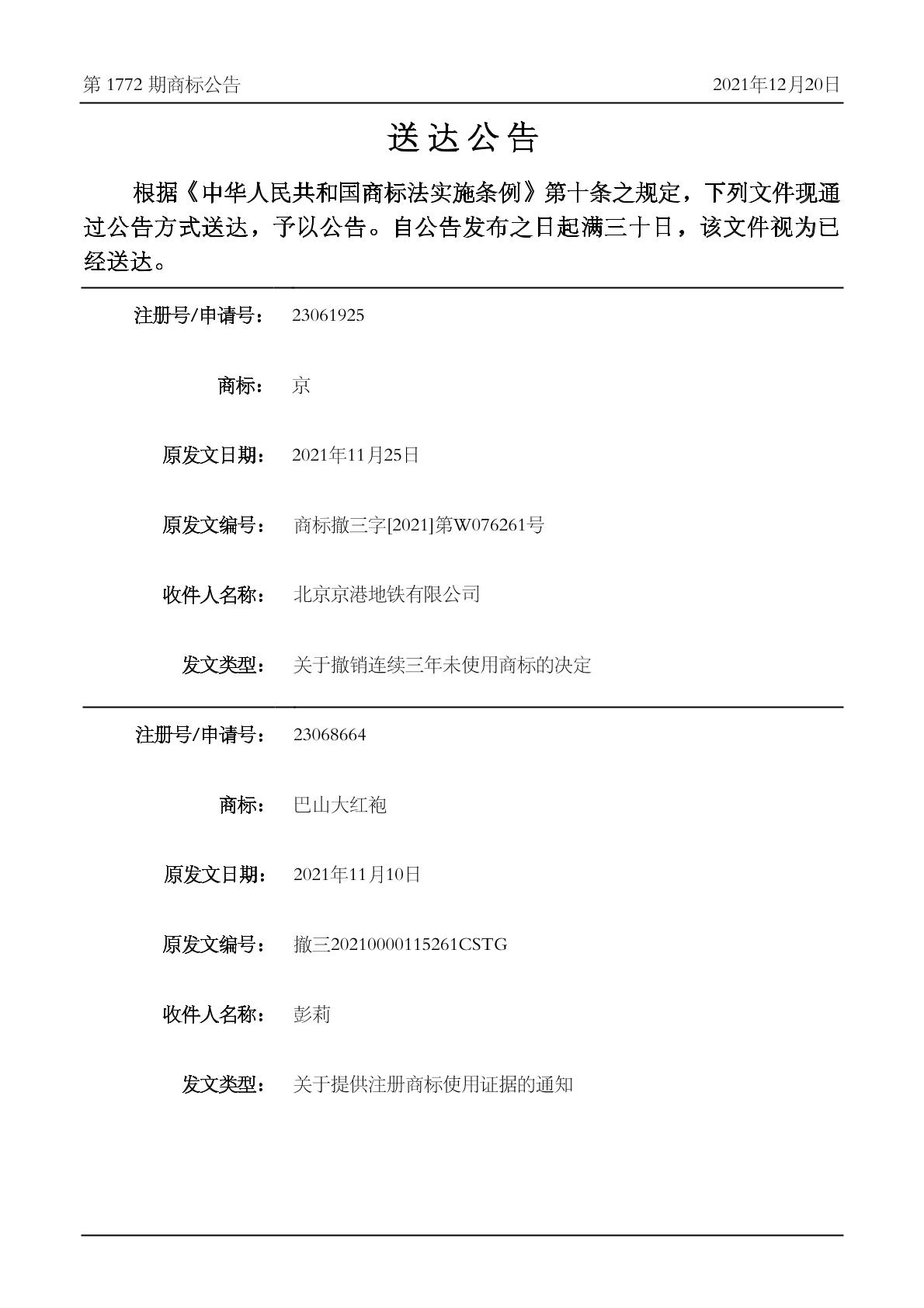 2021-12-21 撤销连续三年停止使用注册商标 | 排版送达公告(关于撤销连续三年未使用商标的决定)