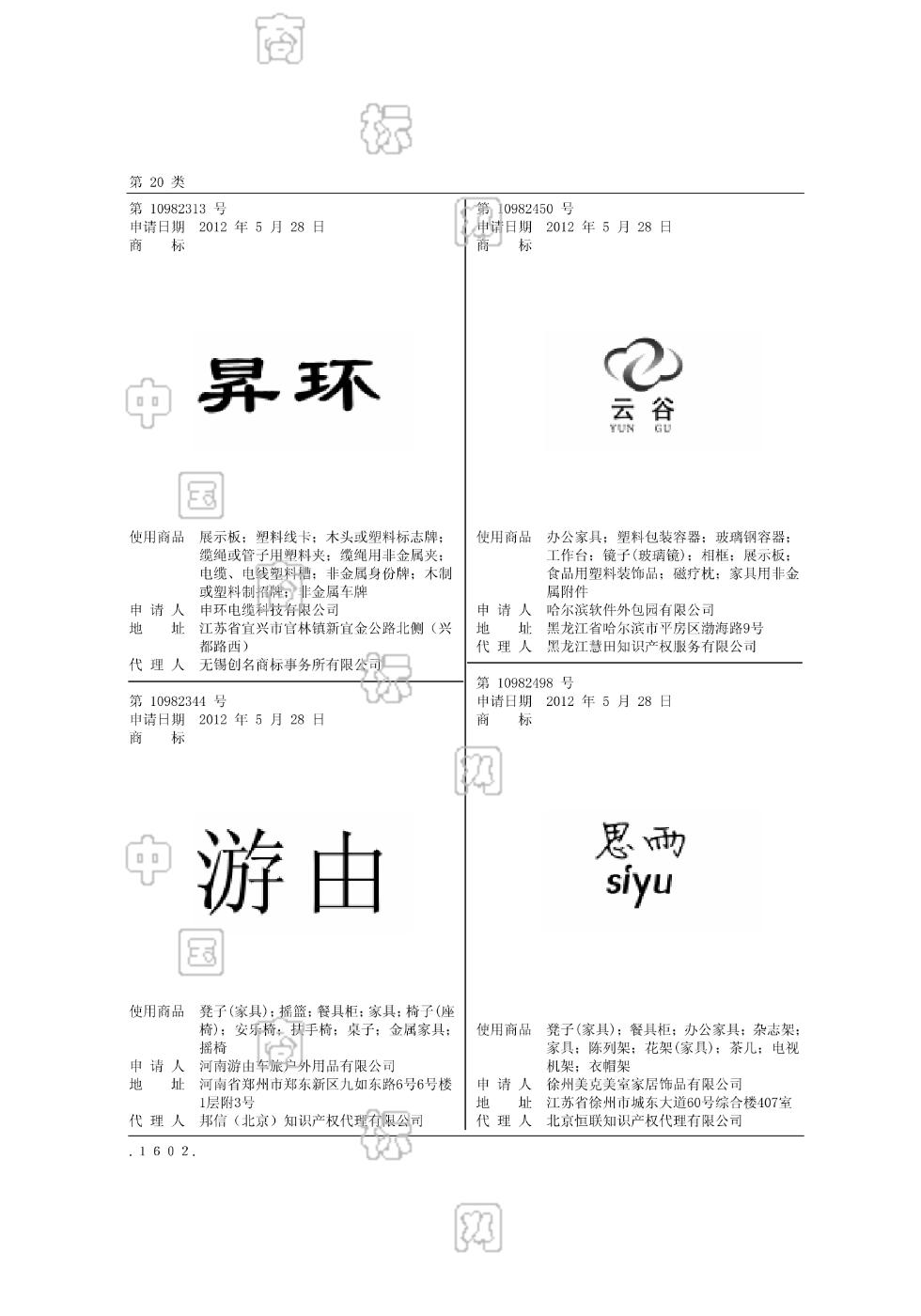 2001-办公家具;2002-塑料包装容器;2002-玻璃钢容器;2003-工作台;2004-相框;2004-镜子(玻璃镜);2007-展示板;2008-食品用塑料装饰品;2012-家具用非金属附件;2013-磁疗枕 - 1364