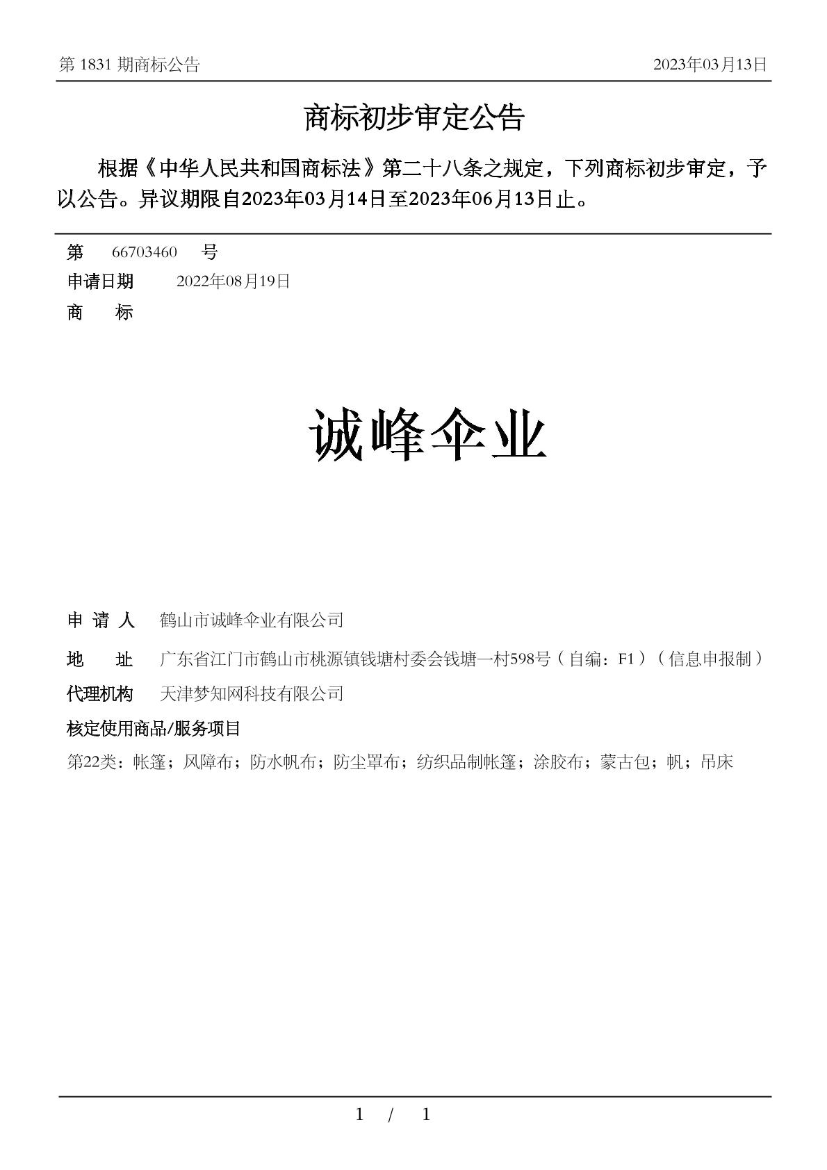 【诚峰伞业】商标详情