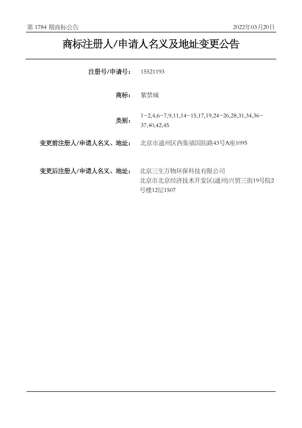 商标注册人/申请人名义及地址变更公告 2022-03-20 第1784期 查看公告